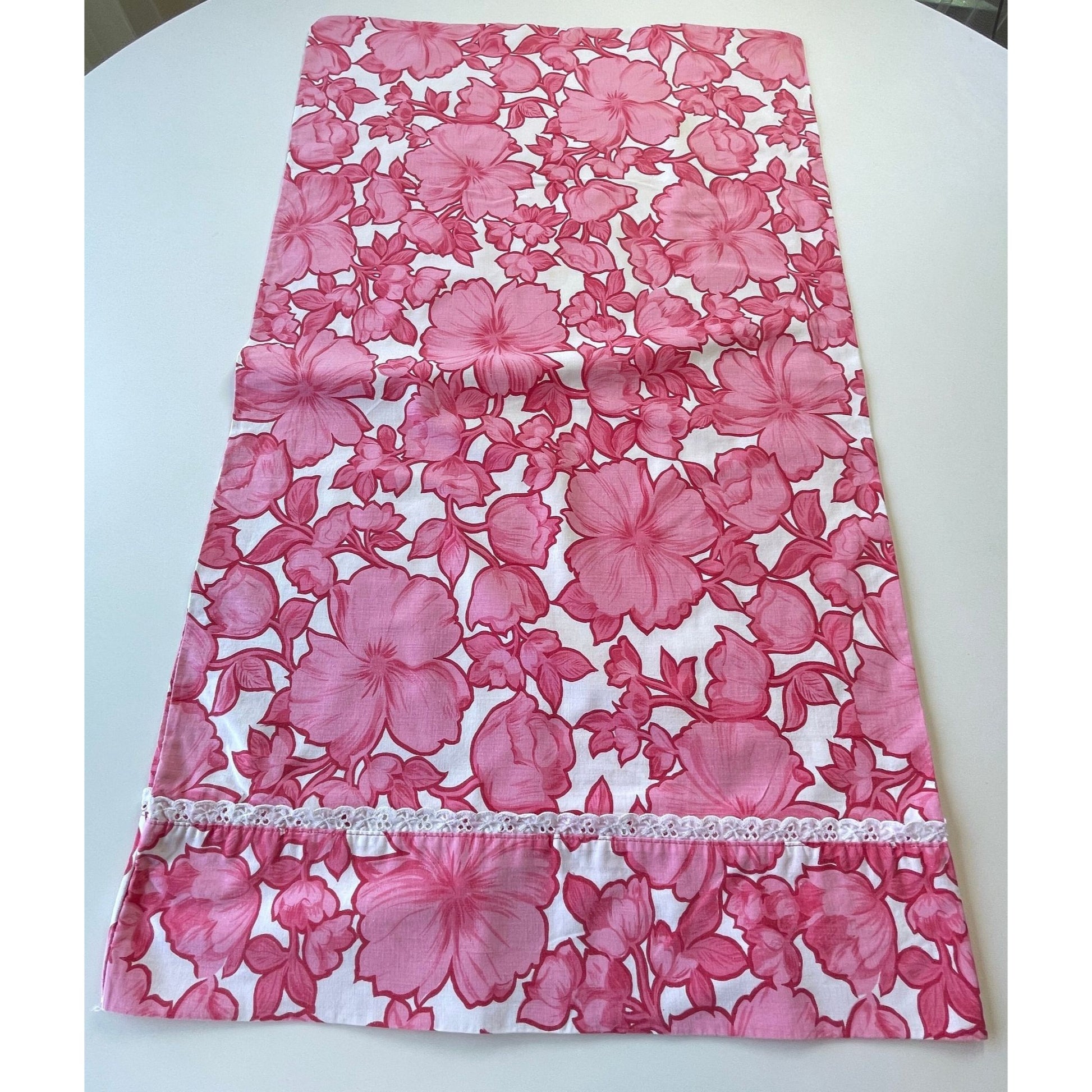 Fabulous 70s pillowcase, large pink hibiscus flowers, with a lace piped top hem.