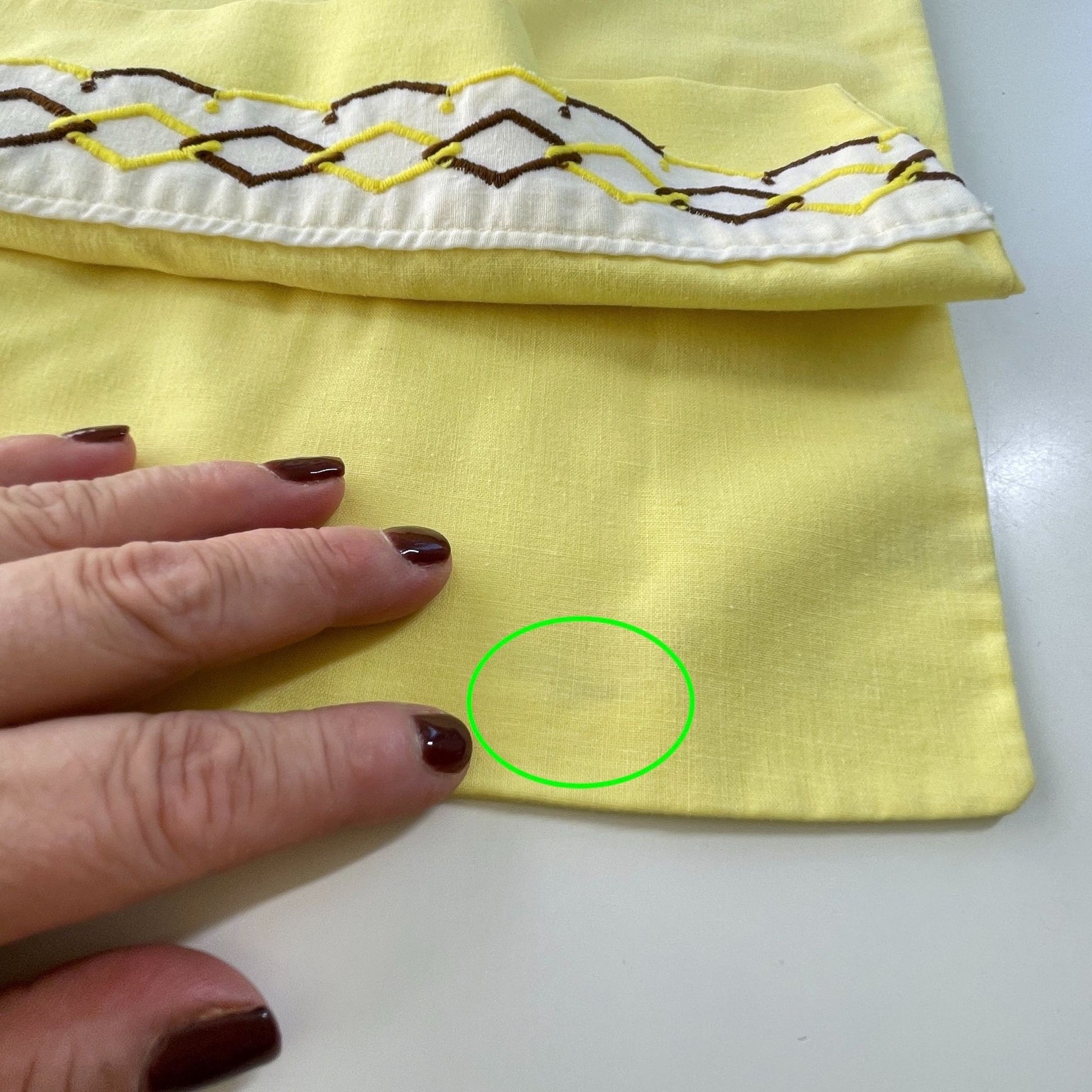 Solid yellow color with a white, brown and yellow embroidered trim.