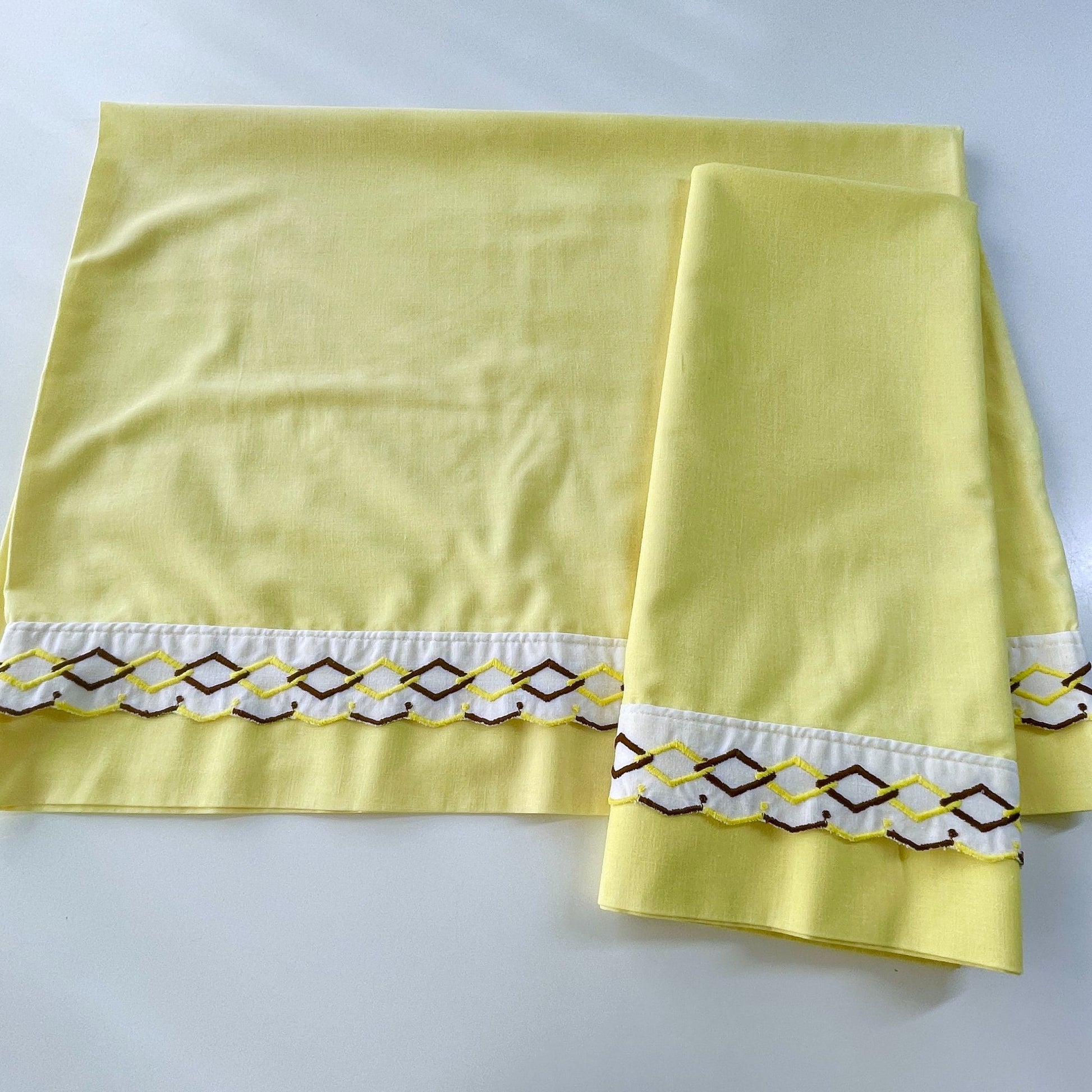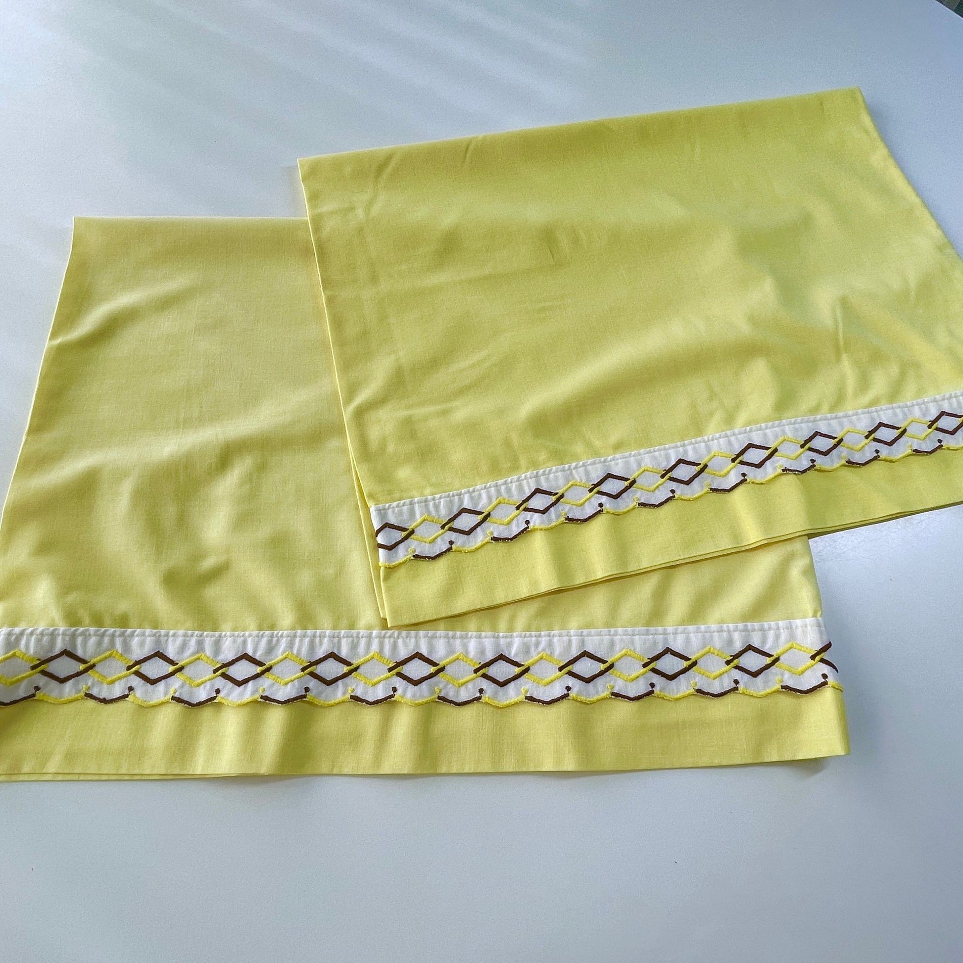 Vintage 70s pillowcases set, solid yellow with embroidered trim, TruPrest