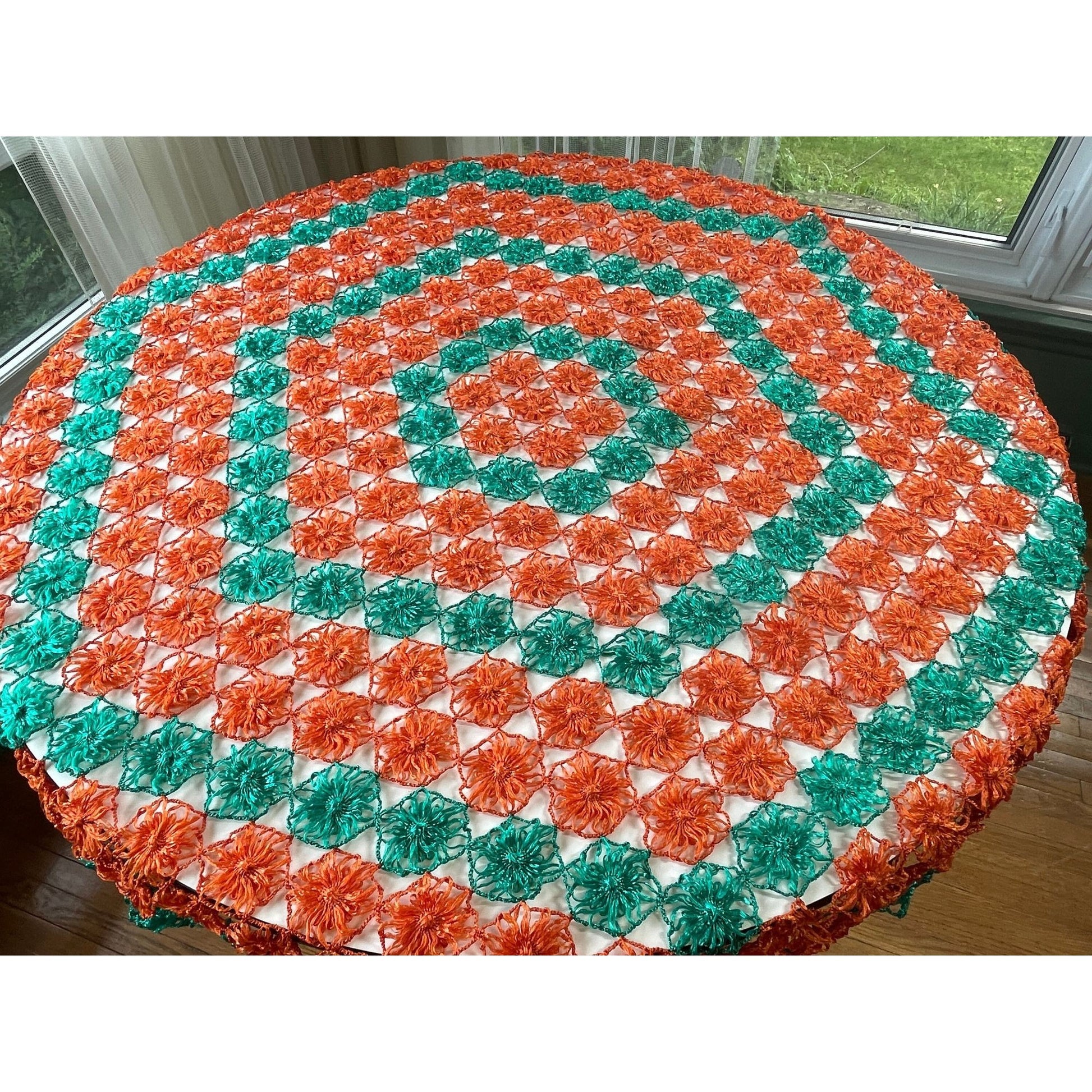 Synthetic raffia is a waterproof yarn, used in many craft and in this case, it was crocheted into 2.5" flowers, in orange and turquoise, making this stunning tablecloth.