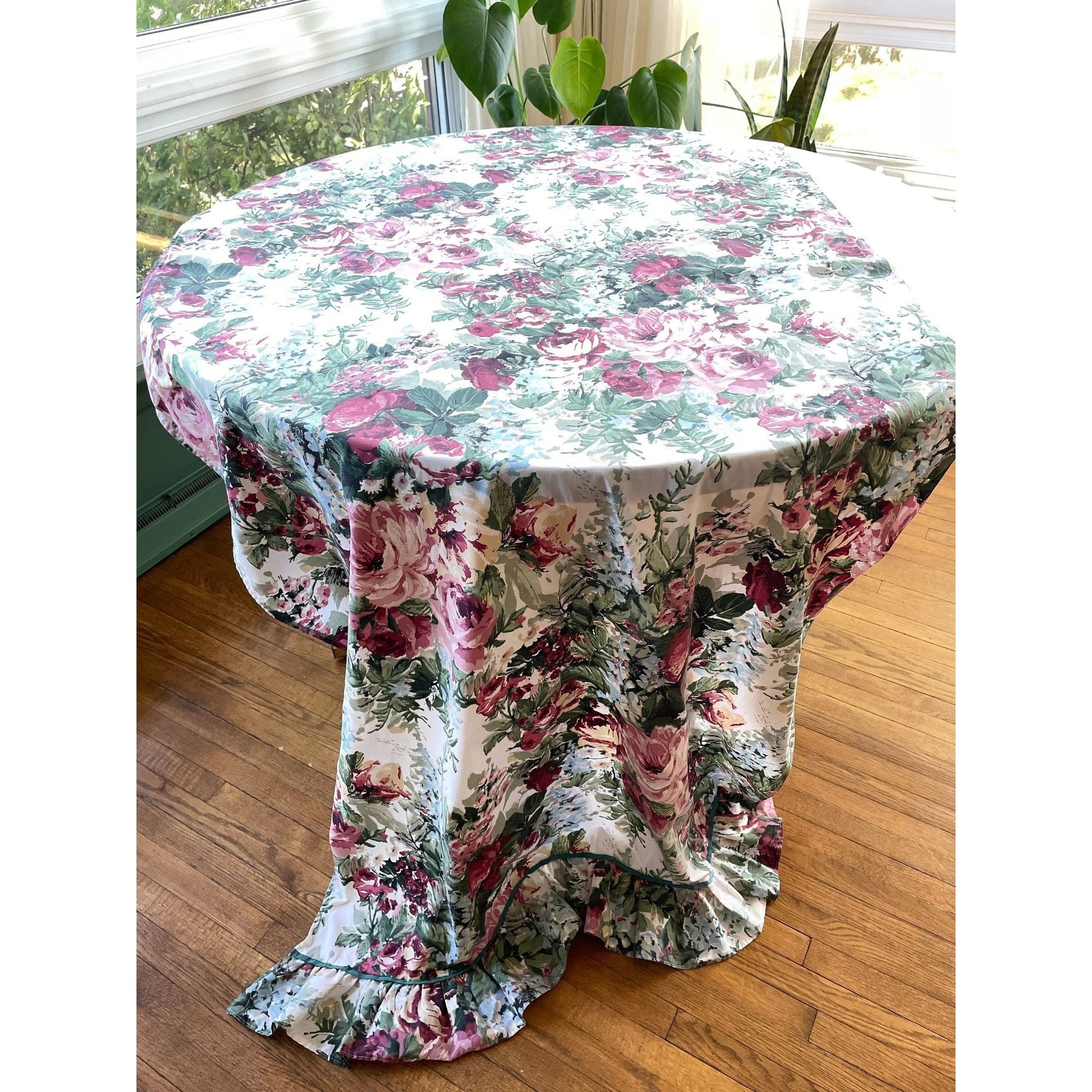 Vintage 80s curtain, green pink floral, ruffled bottom panel