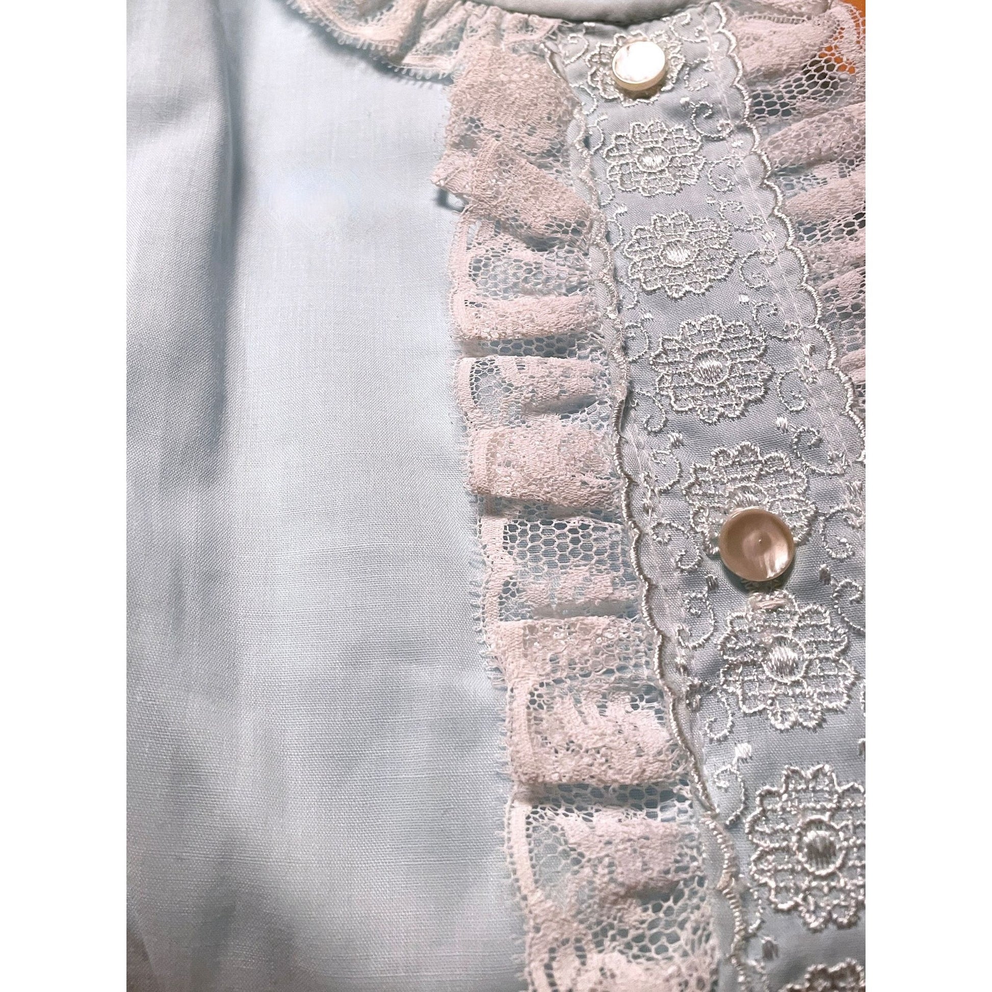 The peignoir has 3/4 length sleeves with ruffled cuffs, full length buttons with a ribbon at the waist.