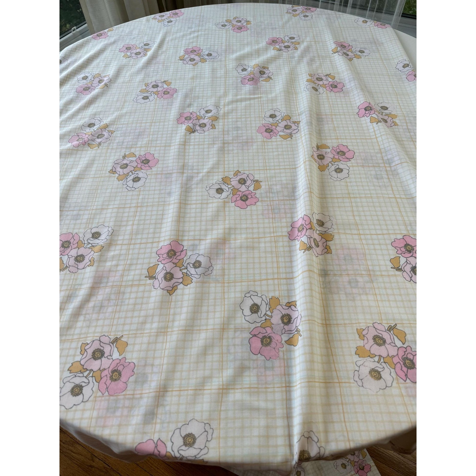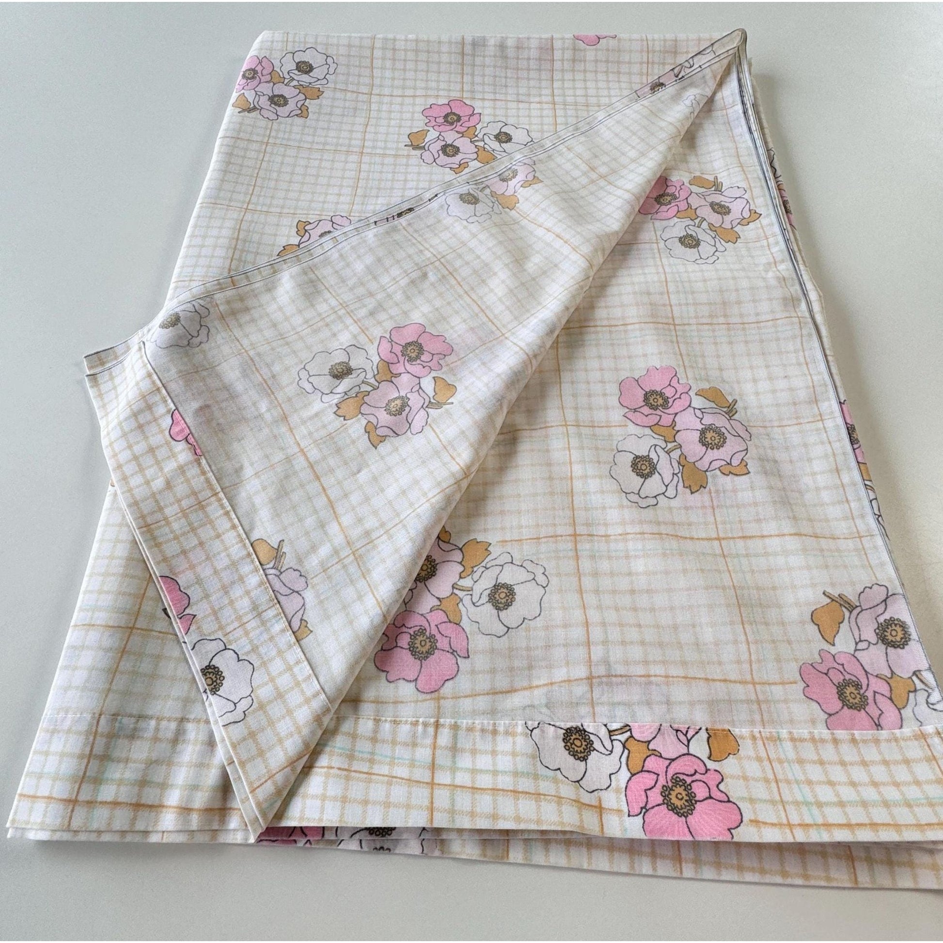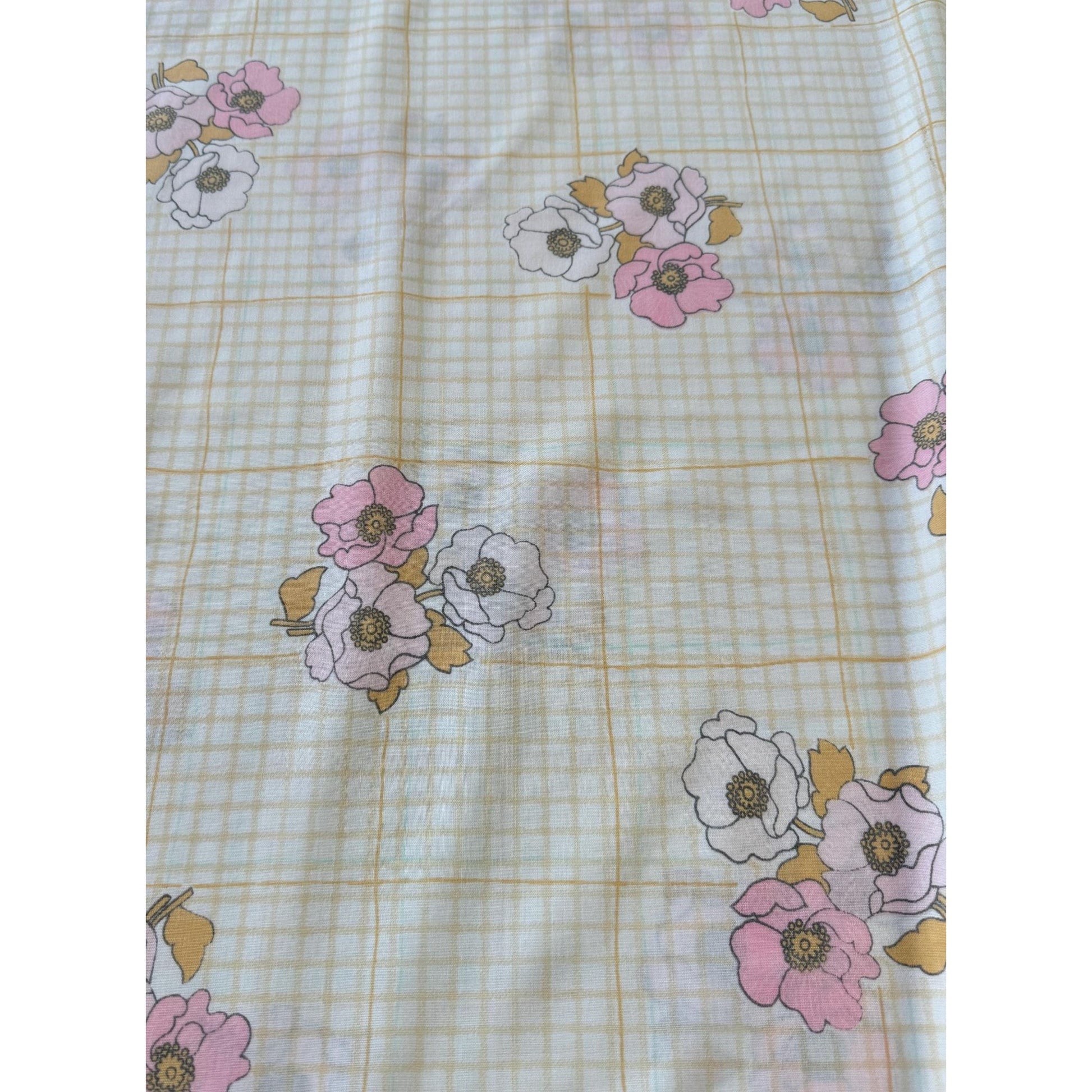 Vintage 1970s top/ flat sheet, small pink flowers, twin size, TruPrest