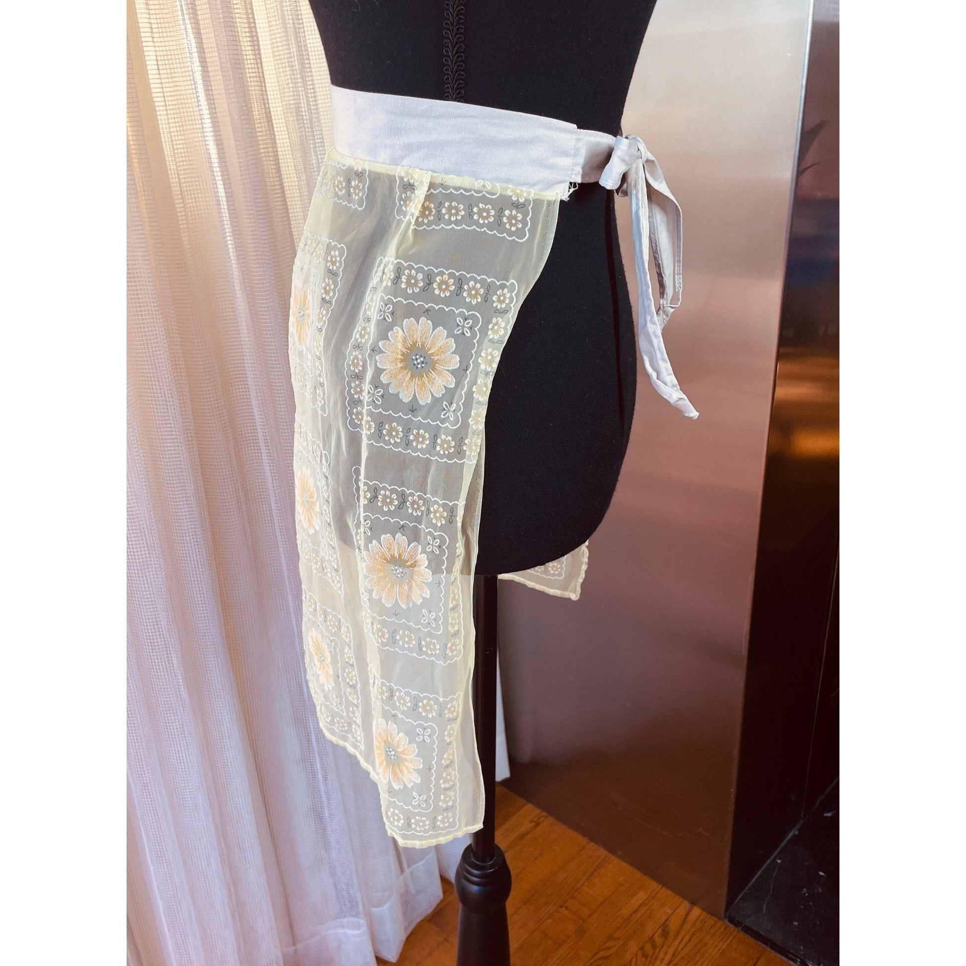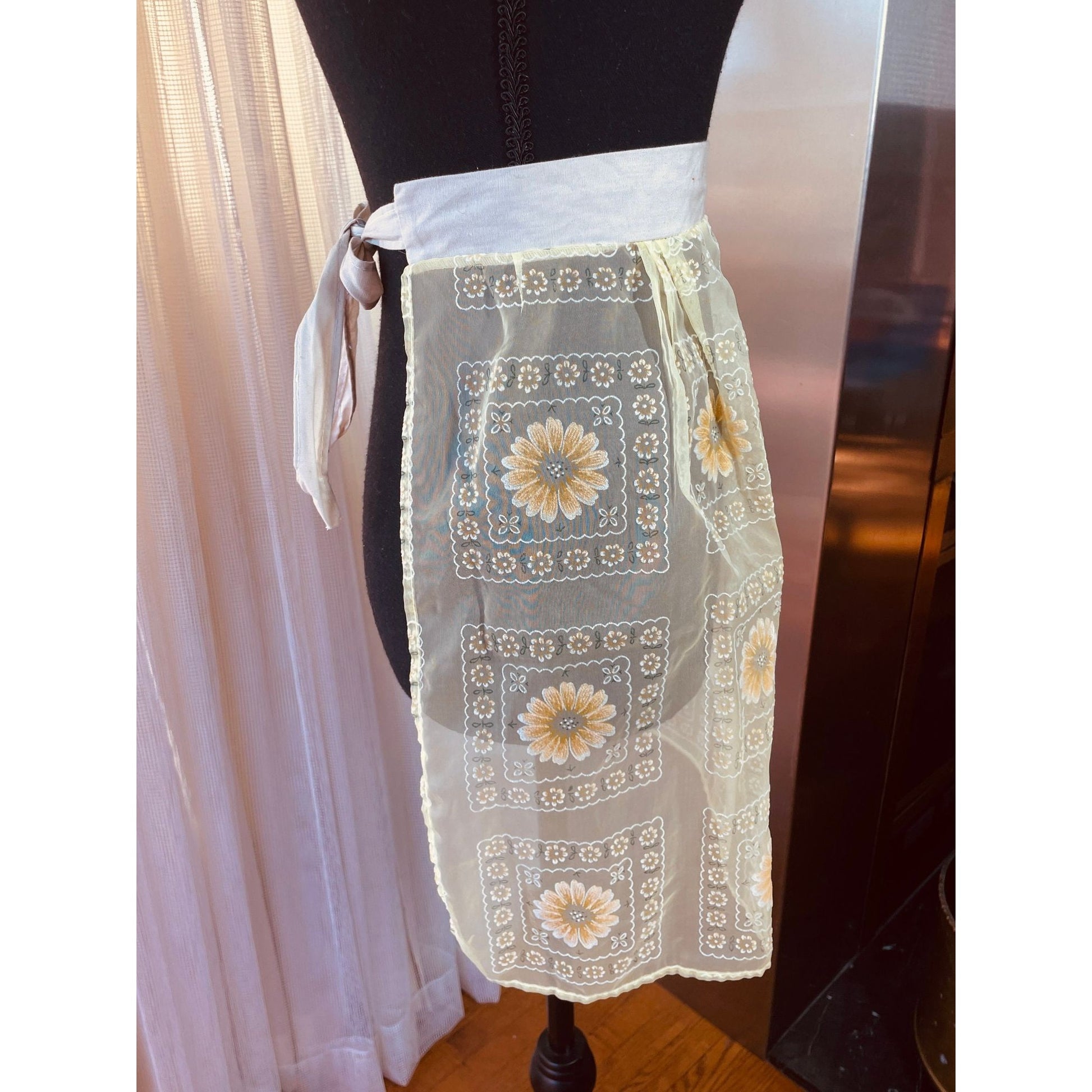 So adorable! vintage 50s half apron. Flocked flowers organza chiffon, light yellow with large daisies and square pattern.