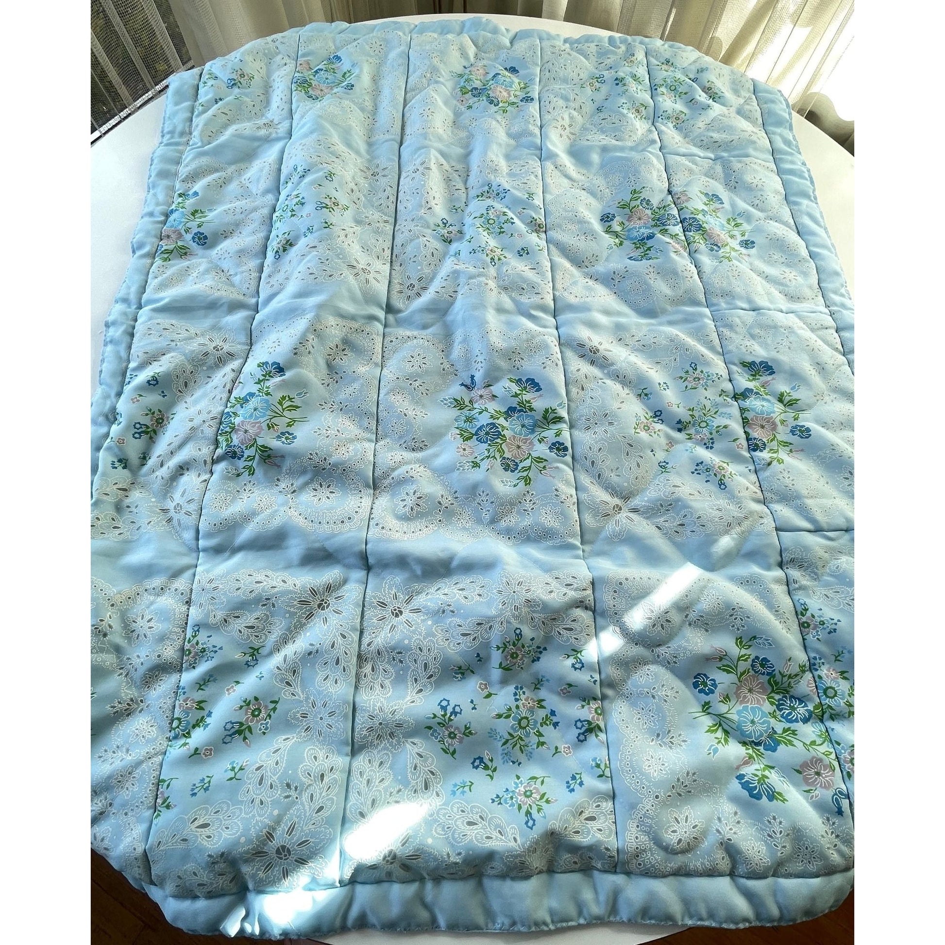 60s quilted blue blanket with delicate floral print in white, grey and pink.