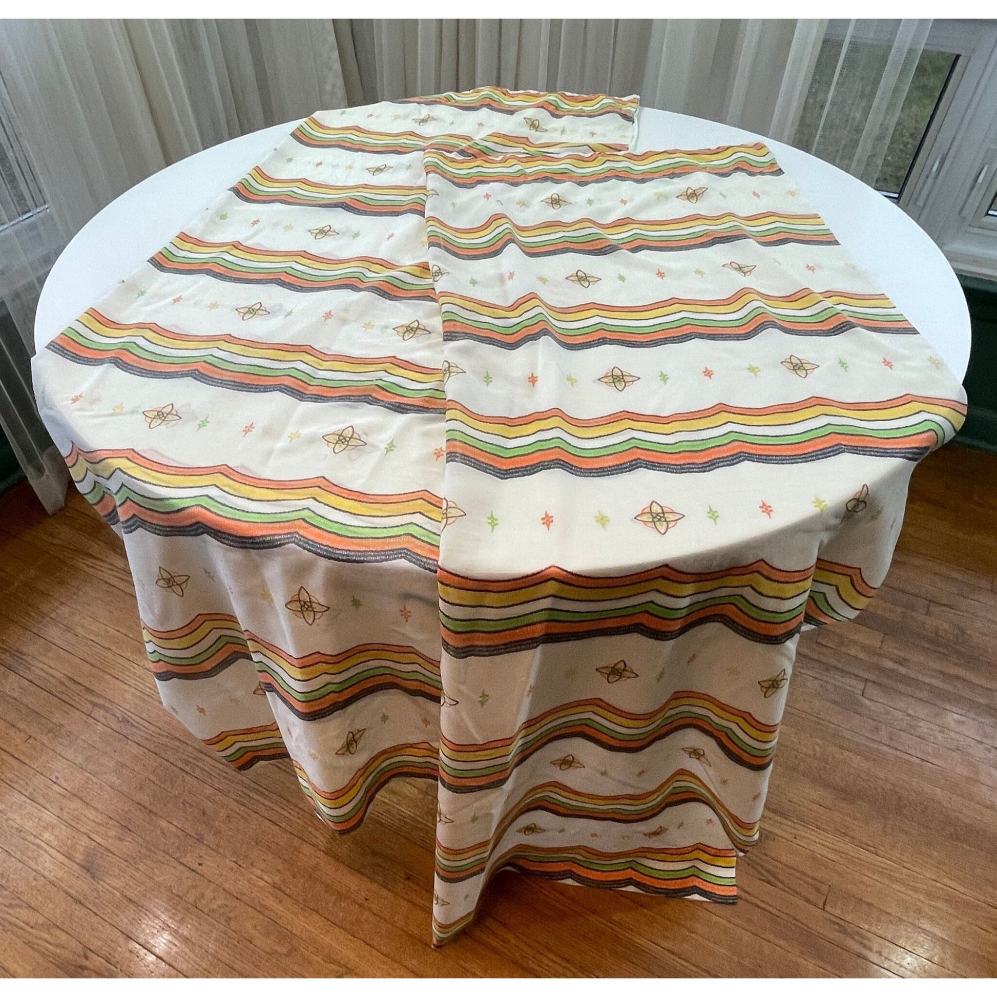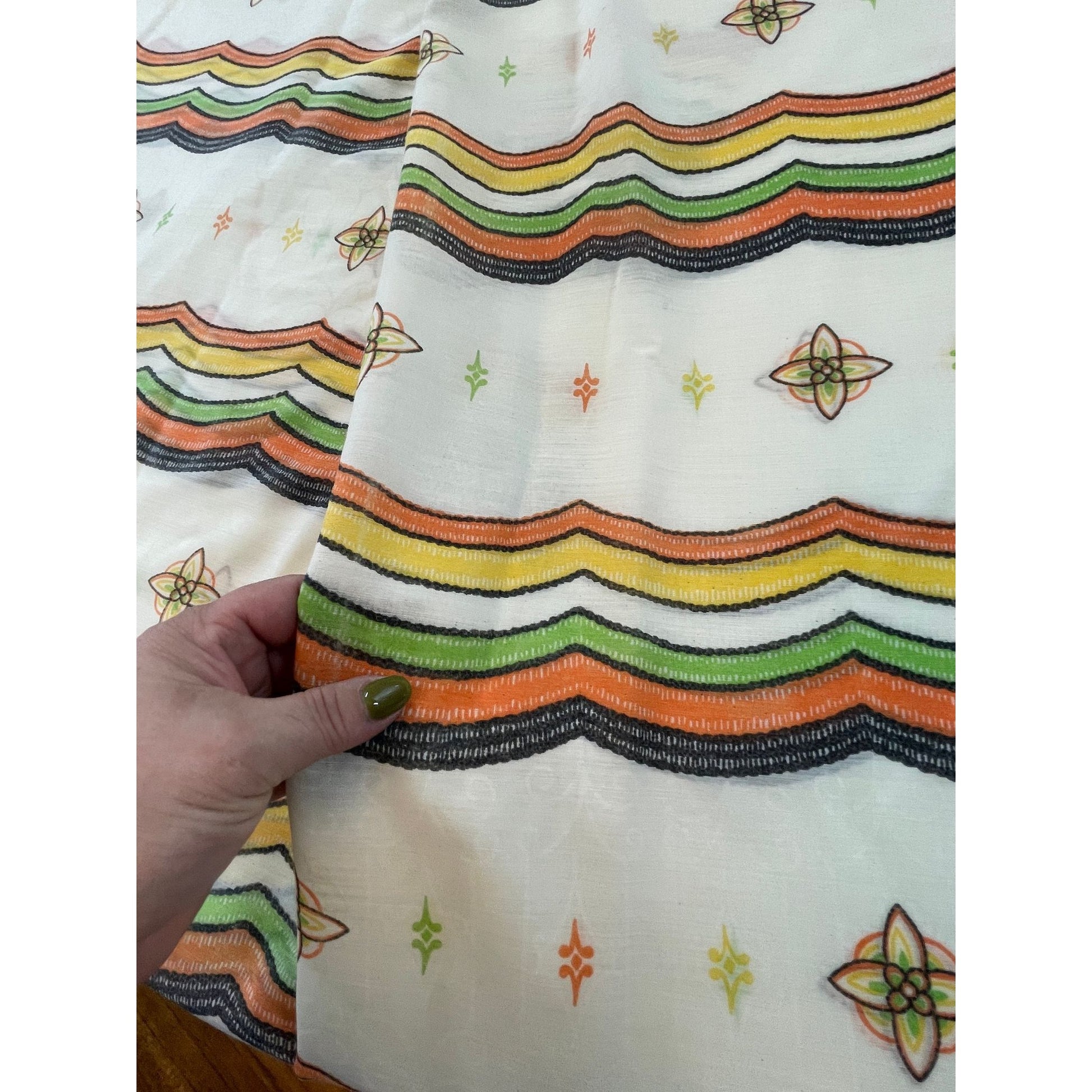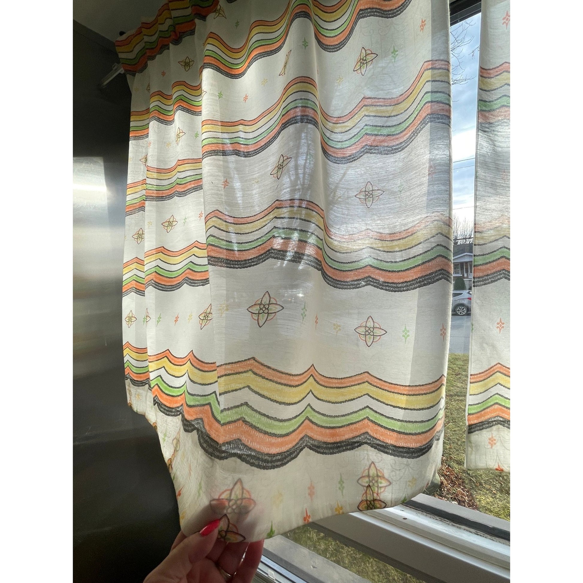 Vintage 60s geometric pattern curtains, orange green and brown