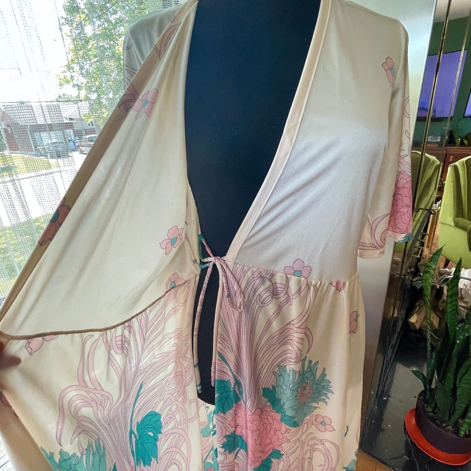 made by Molyclaire in Canada, this gorgeous light weight garment has very large floral print, large bell sleeves. it is exquisitely soft. includes a tie inside and an assorted belt.