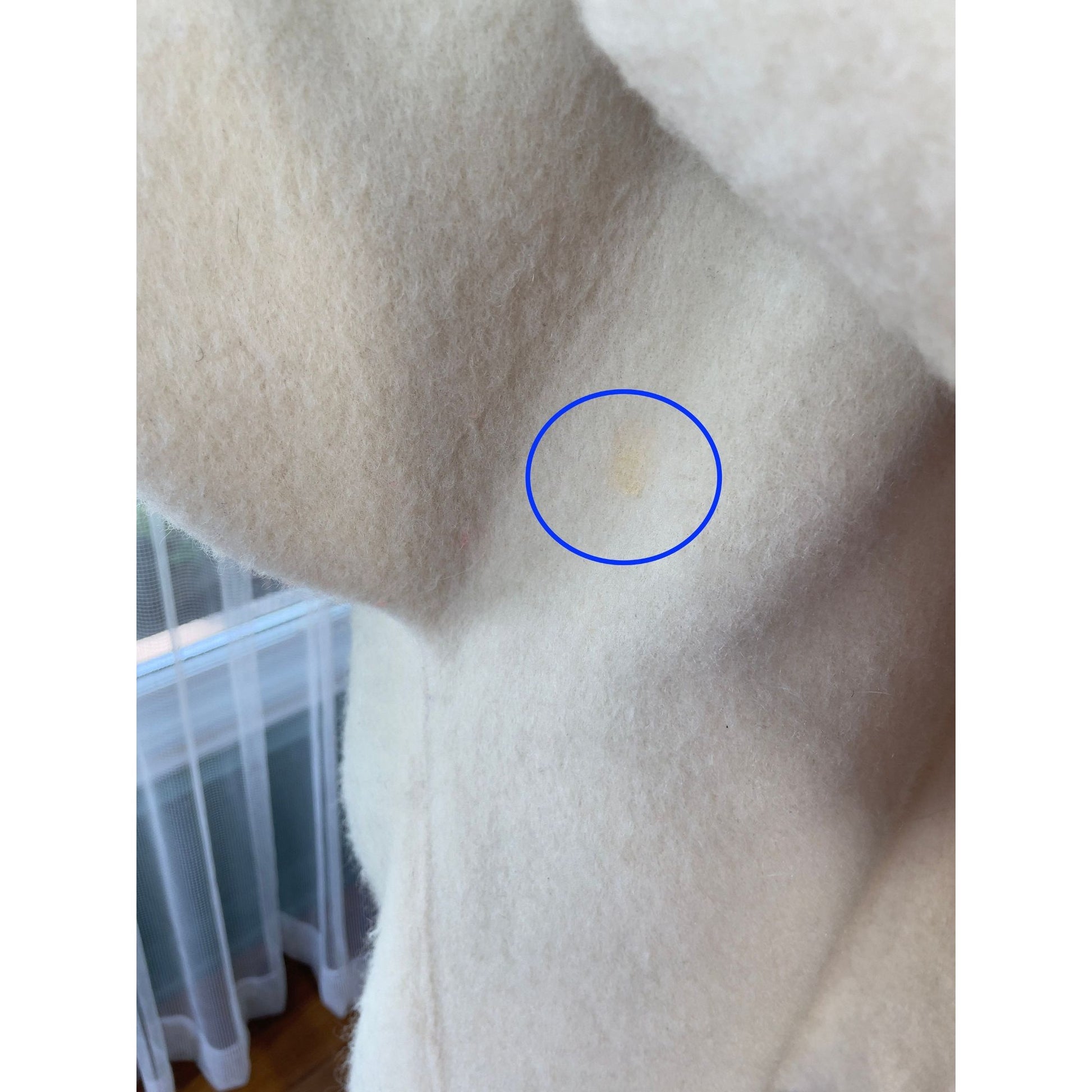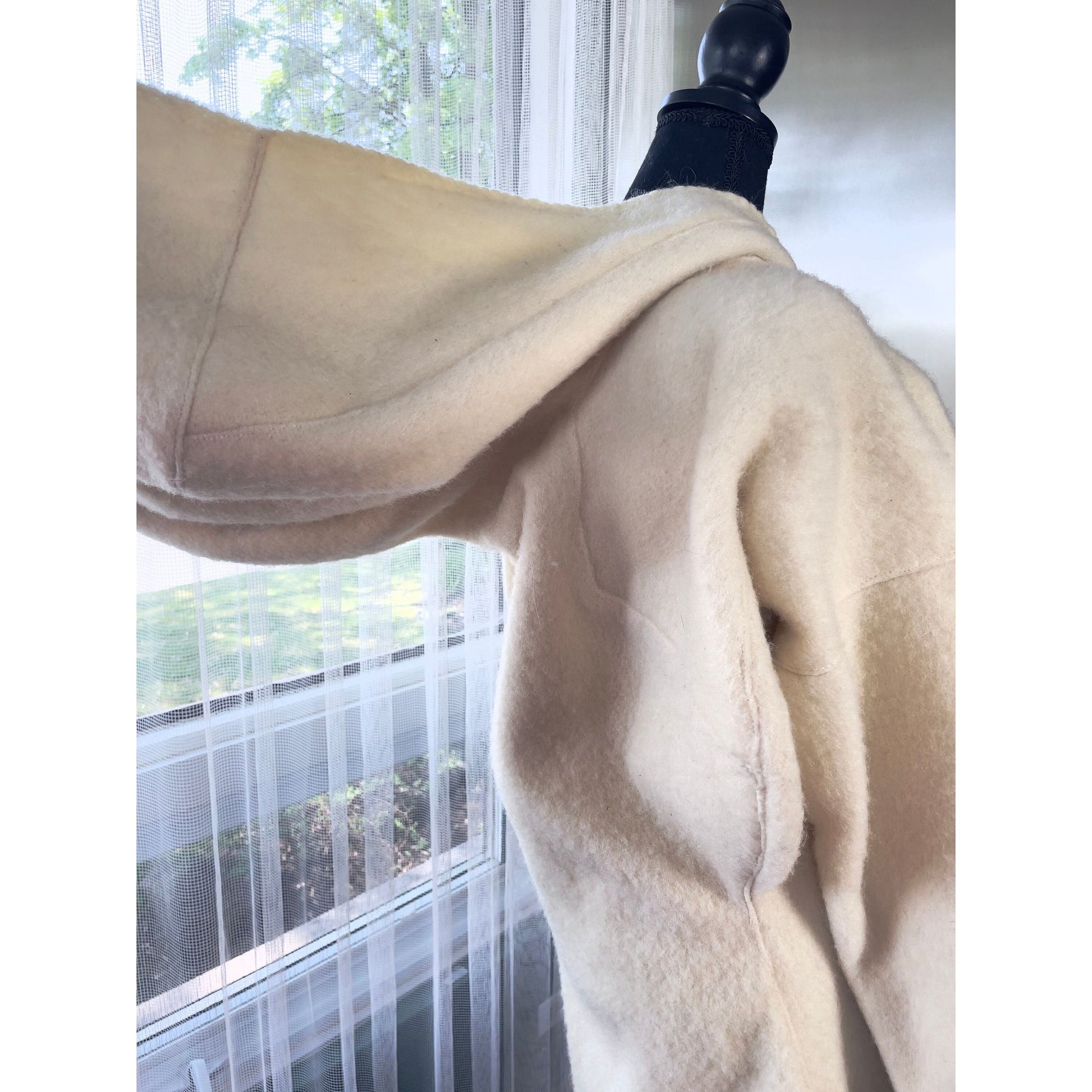 The coat is 100% wool in ivory/cream color, with a large embroidered ribbon at the bottom hem and at the front. It does not have any closure as it is meant to be slipped over the head.