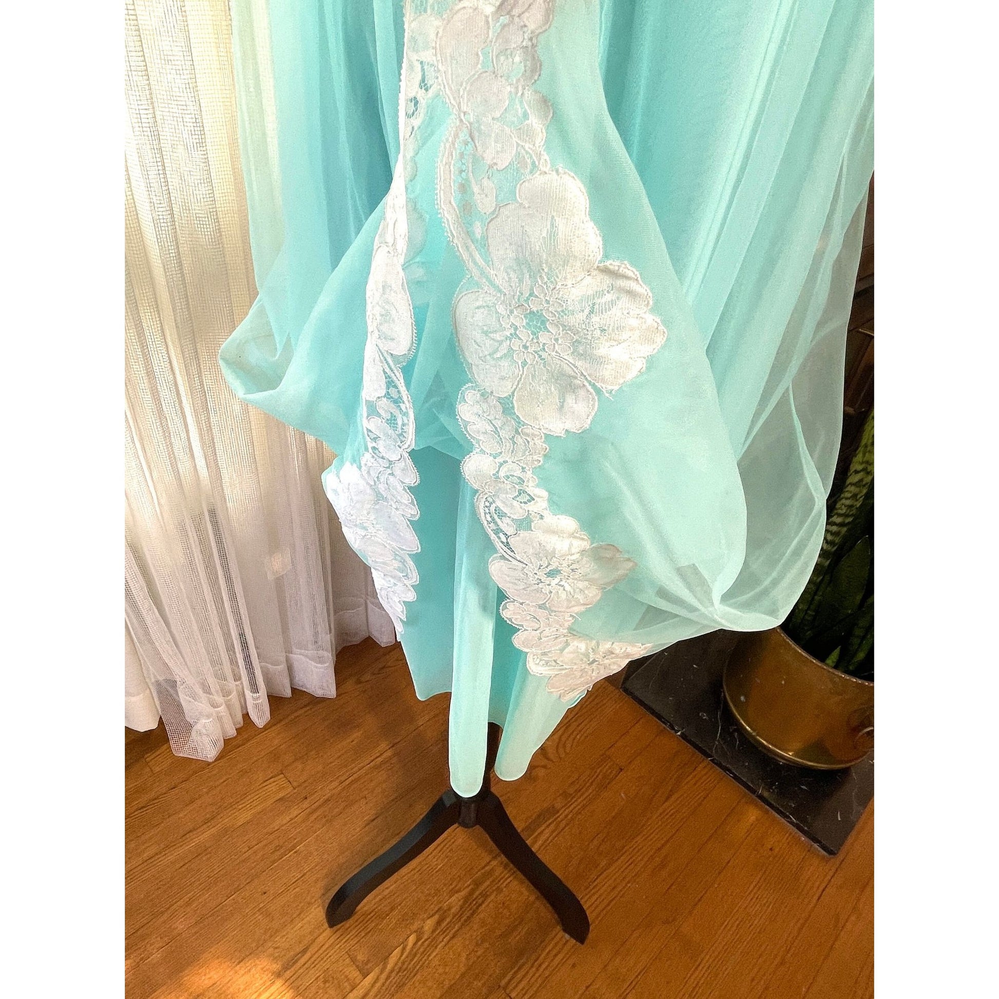 soft blue, with a hint of teal, white lace at the neckline and hem; it has two layers which provides a nice flow. Length is just above the knee.