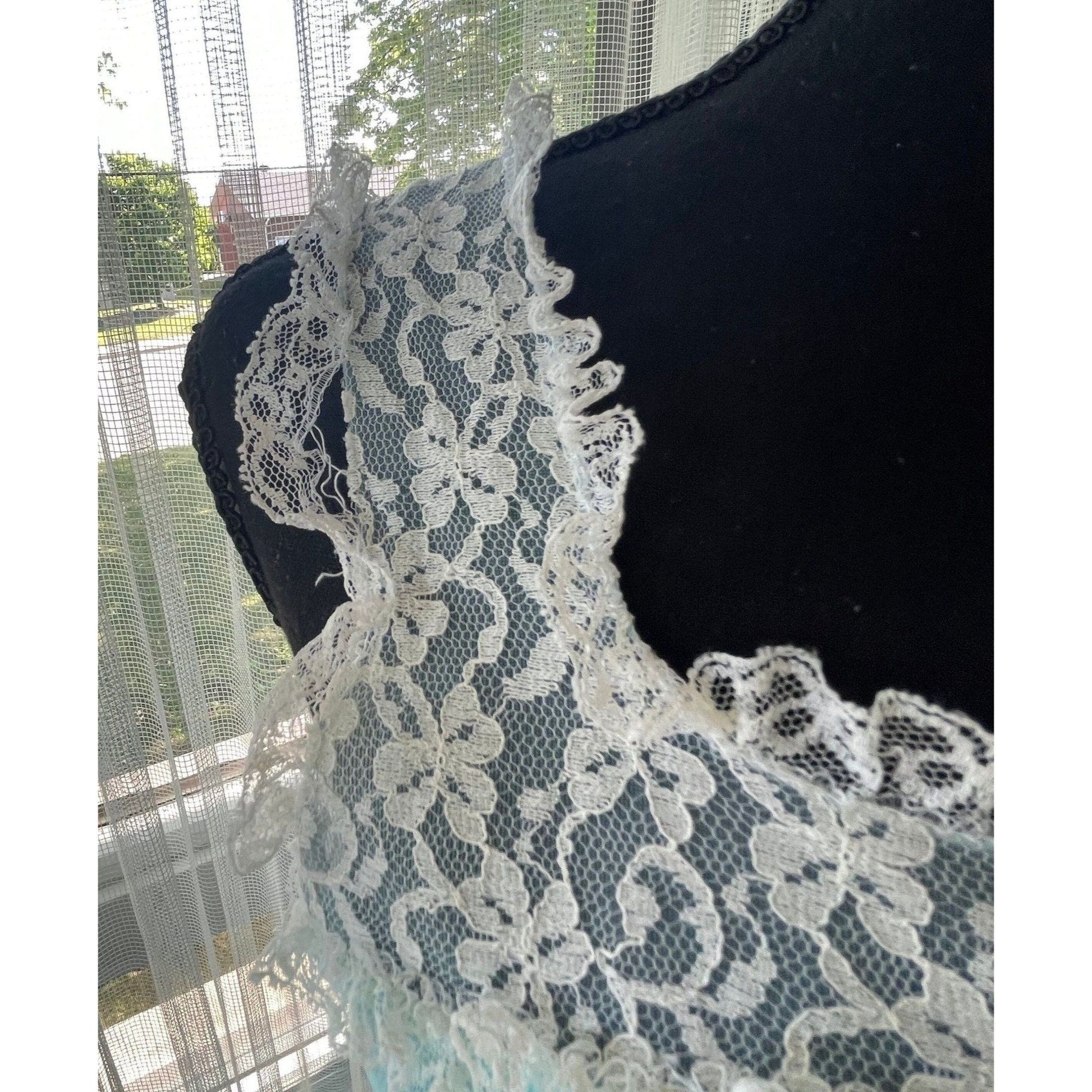 soft baby blue, white lace bib and blue ribbon; it has two layers which provides a nice flow. No label so unknown maker. Length is mid thigh.