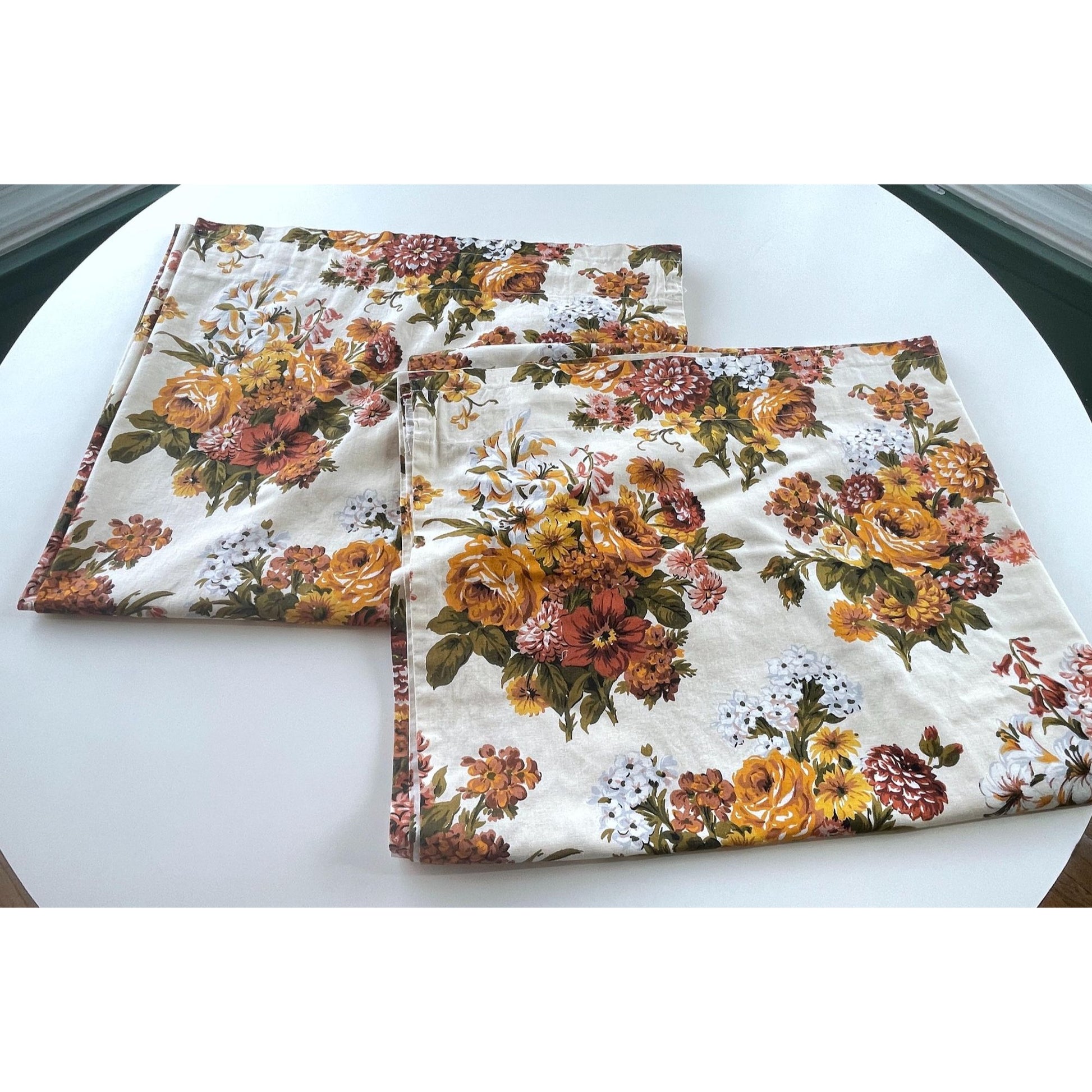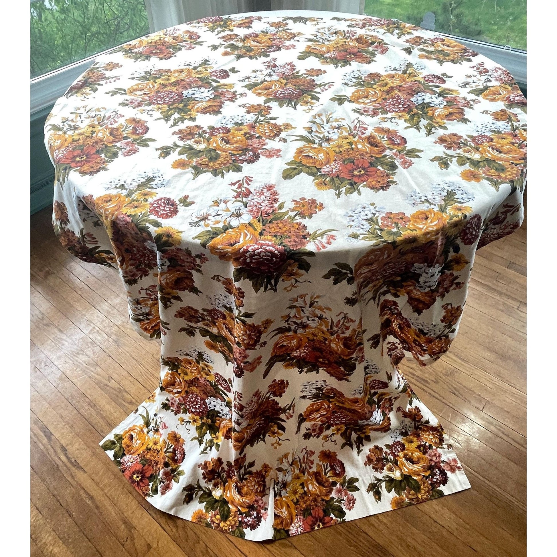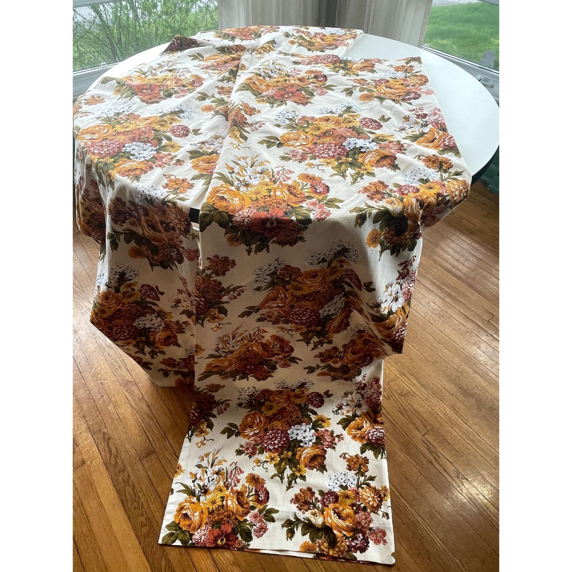 Bold brown, orange and yellow flower bouquets pattern over a cream background, material is unknown but thick, almost opaque. Selvage on the side mentions screen print.