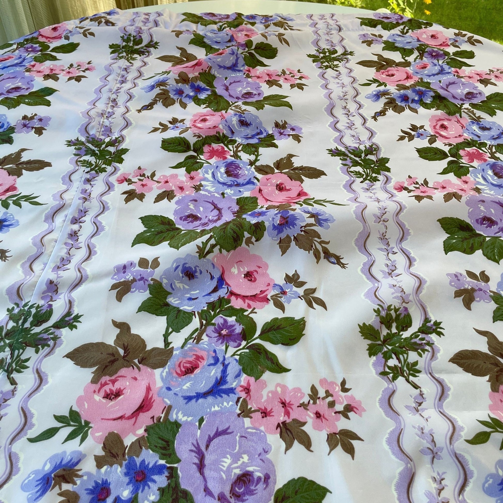 Bold flower pattern in purple and pink with some greenery, over a pastel purple (lilac) background.