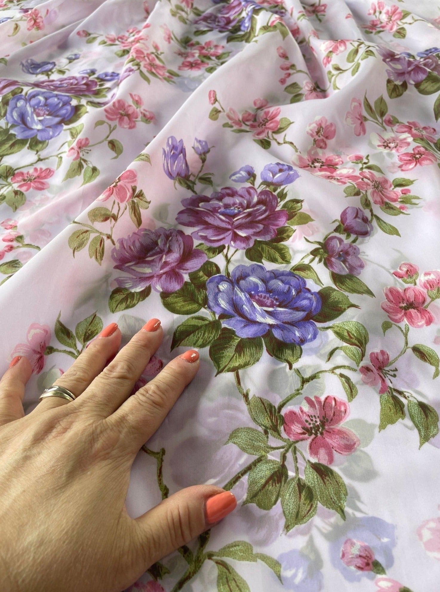 Bold flower pattern in purple and pink with some greenery, over a pastel purple (lilac) background.