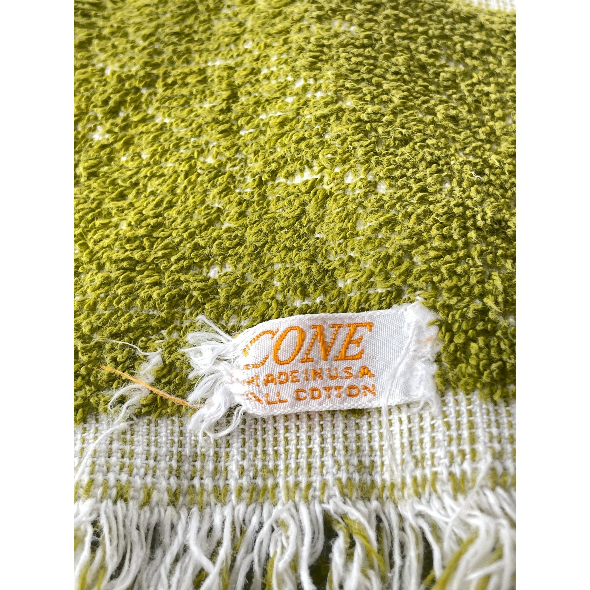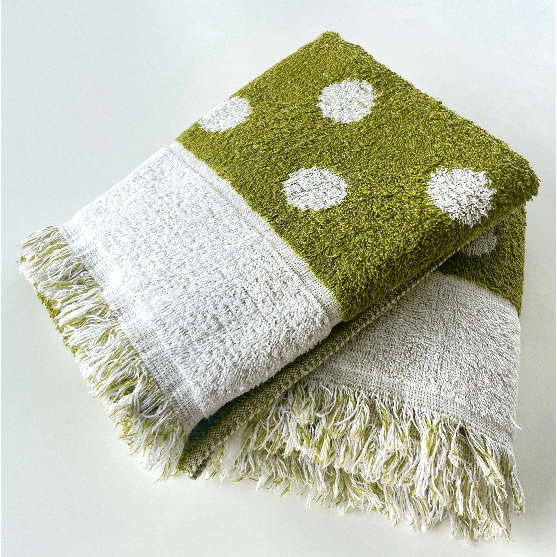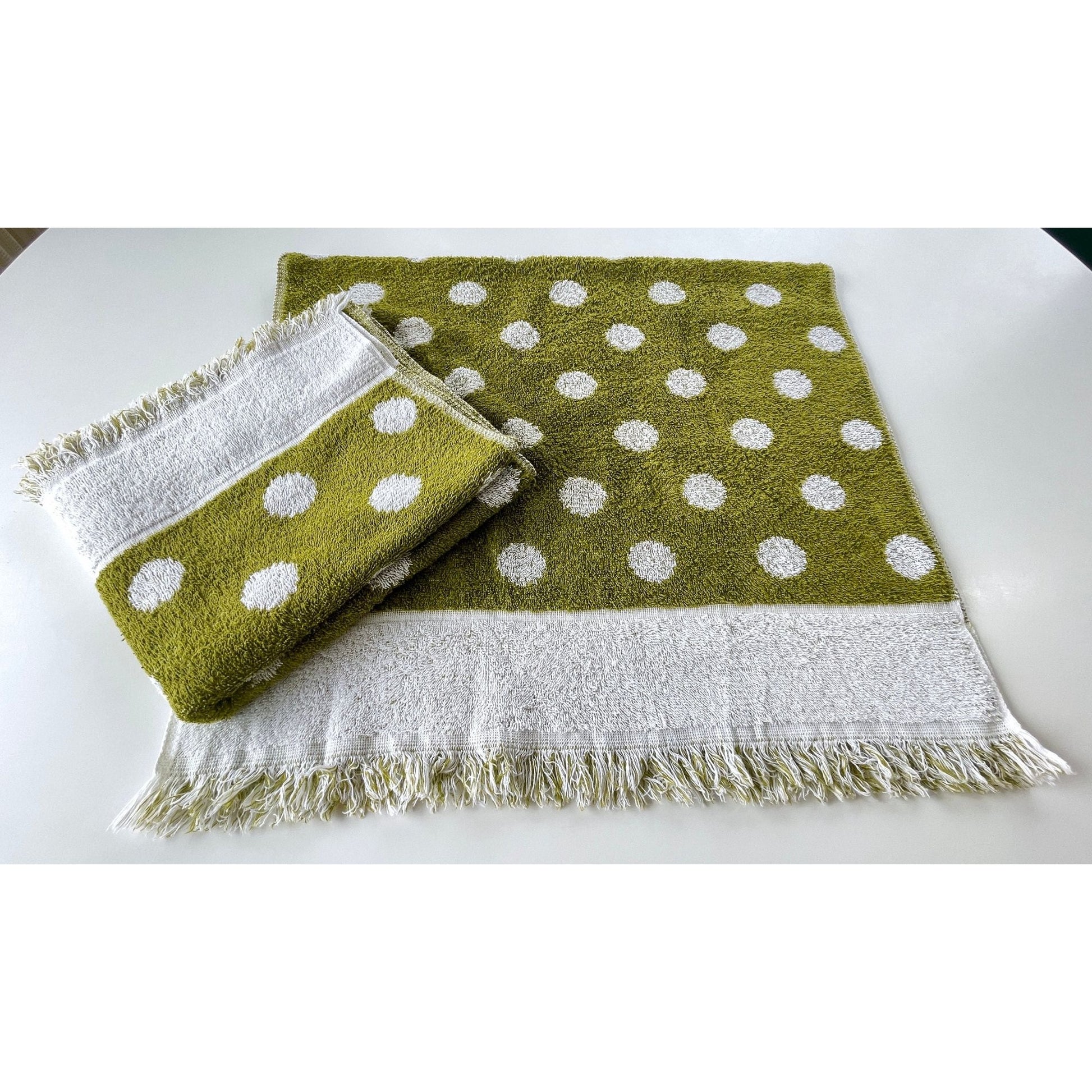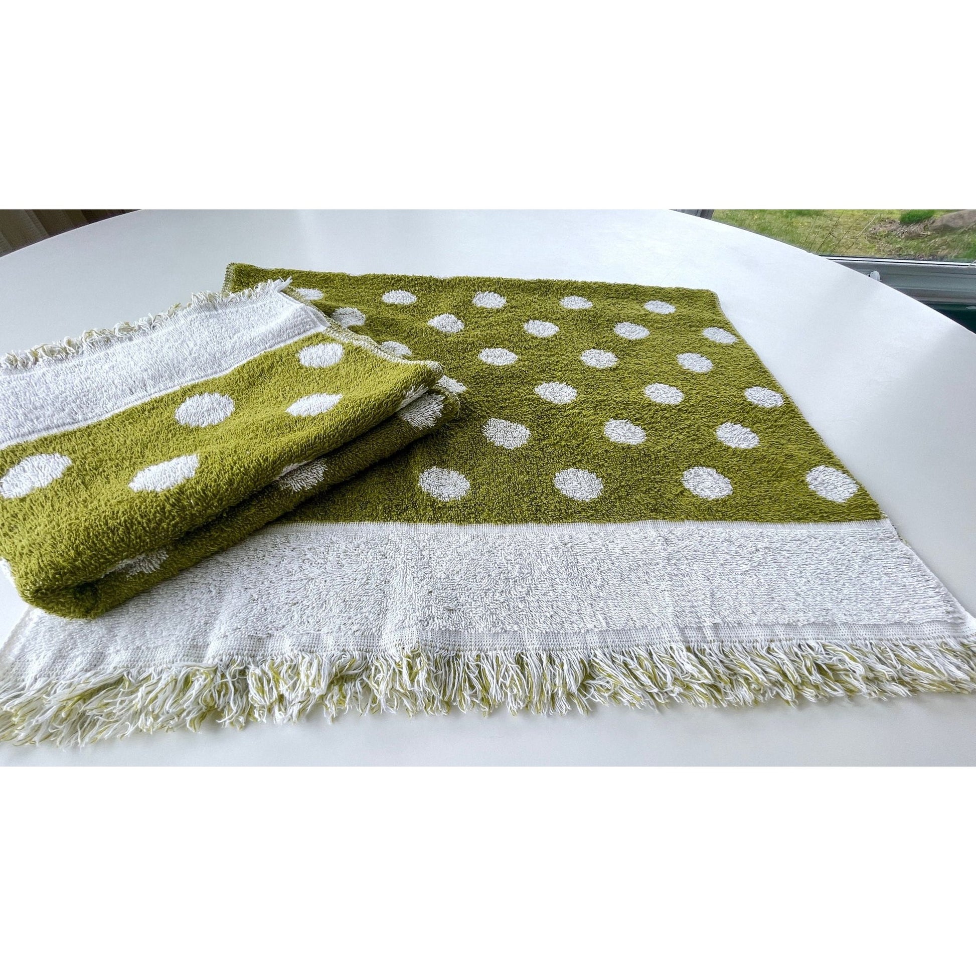 Vintage 70s bath towel, green white polka dots, reversible, Cone 100% cotton