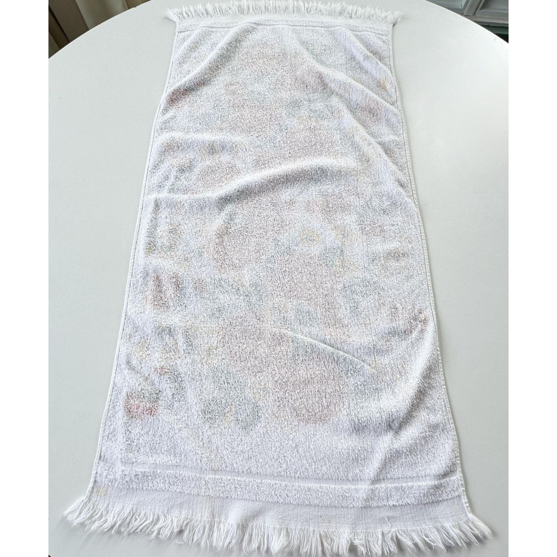 lovely vintage bath towel, orange and yellow flowers with greenery, over a white background.