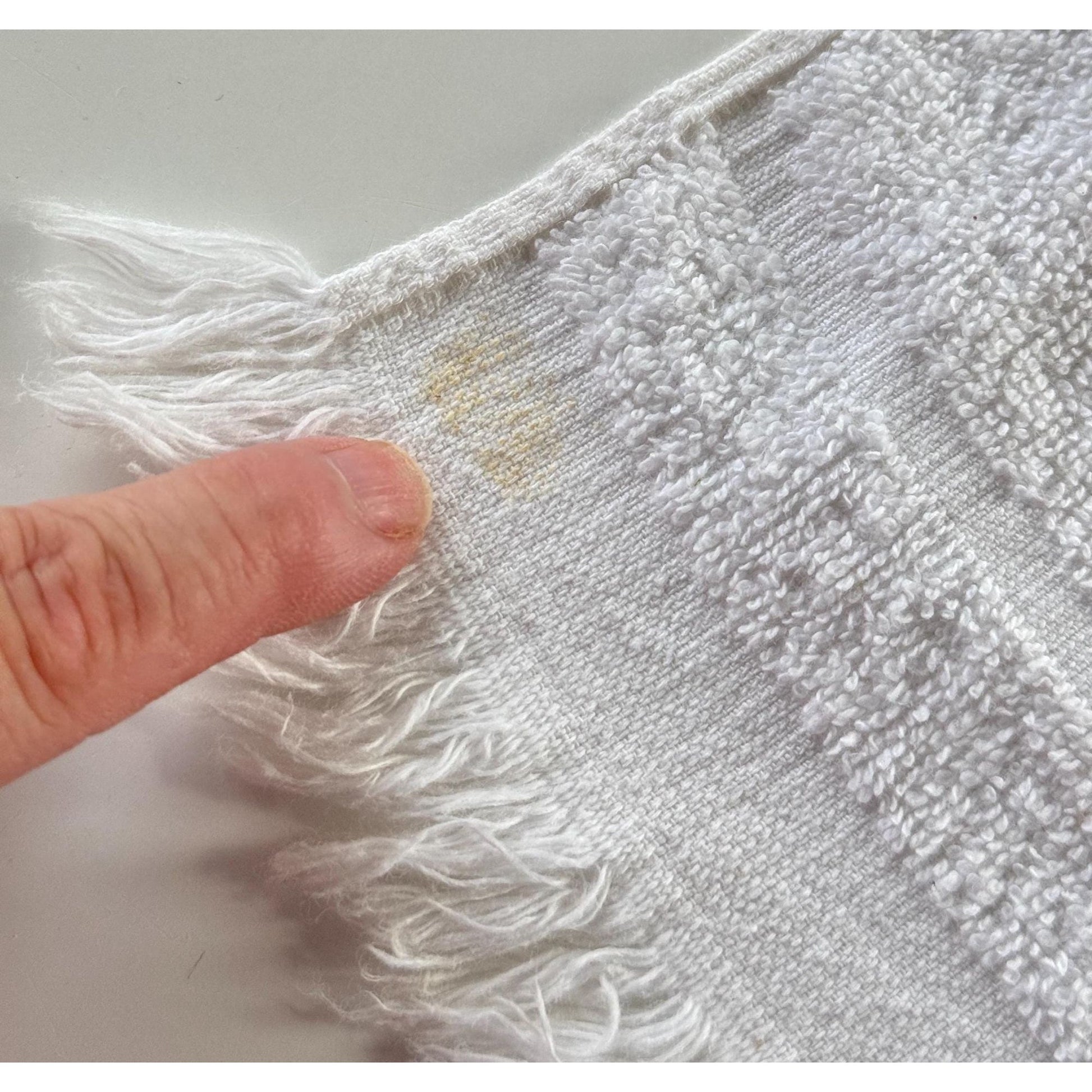 former price sticker residue stayed yellow on the back of the towel and there are some pin size rust stains on the back near the fringes. There is also one run, lengthwise, please see pictures for accuracy.