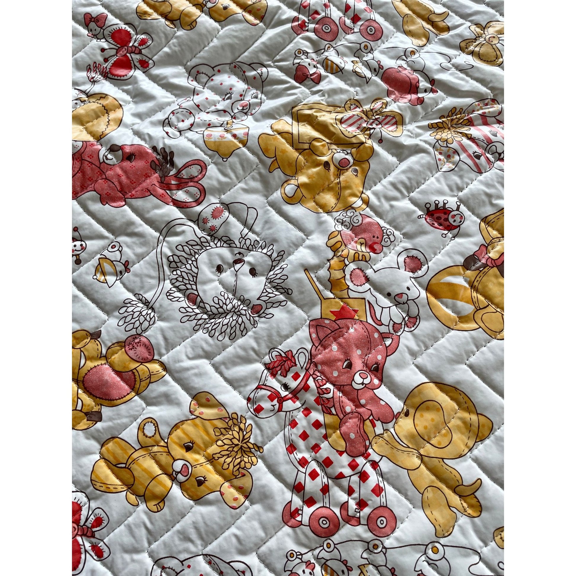 This bassinet cover is so adorable! Quilted plastic over a thin layer of material. White background with a multitude of cute little animals: lions, bears, horses, in iconic 70s designs.