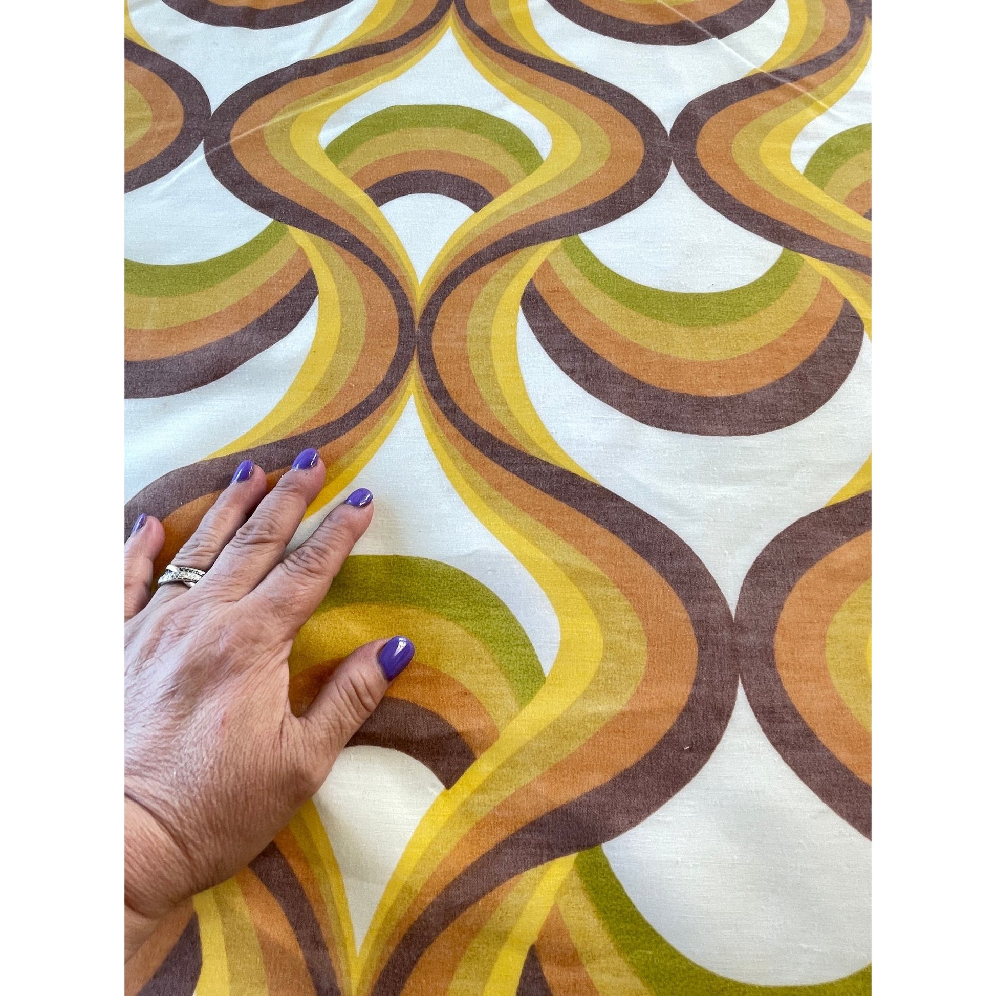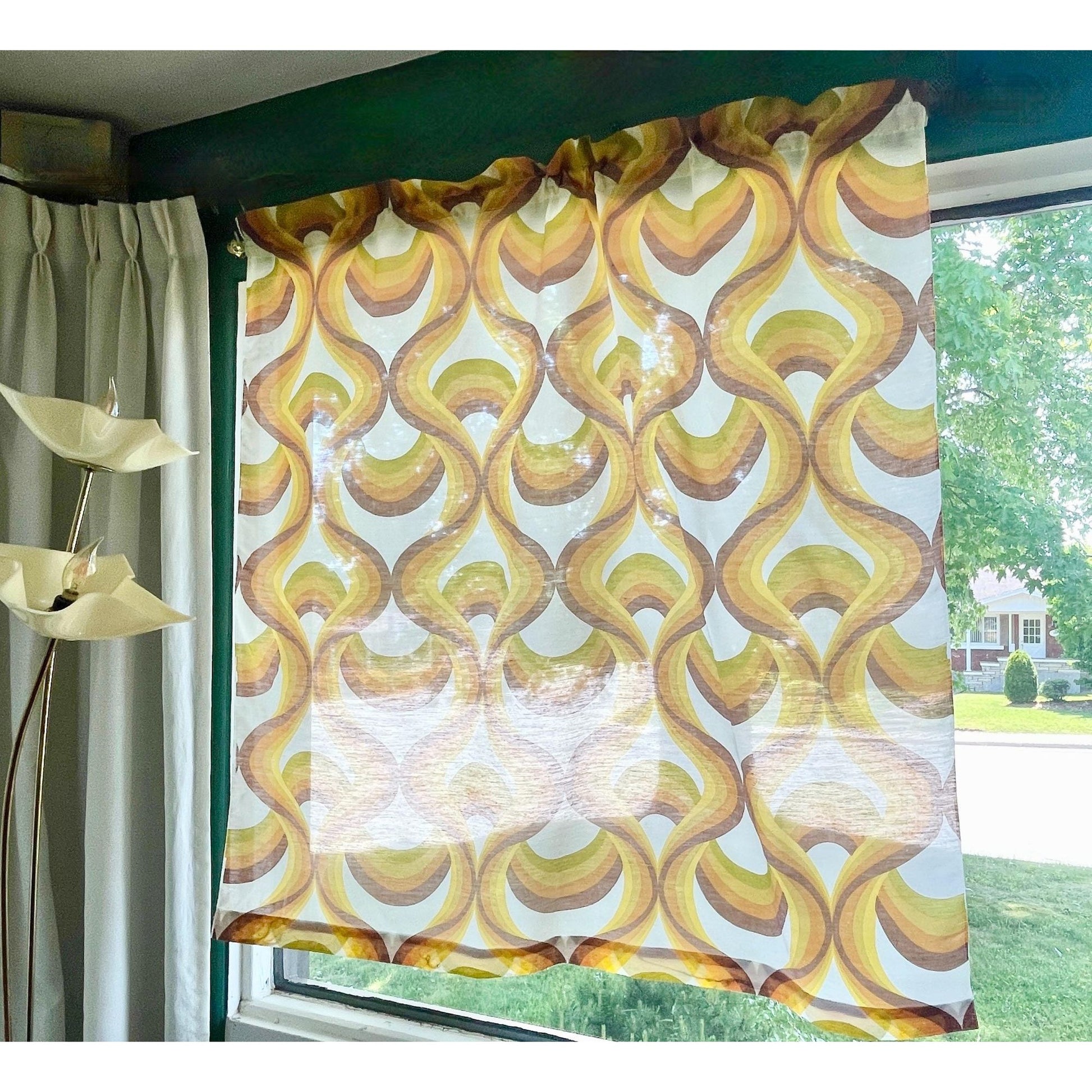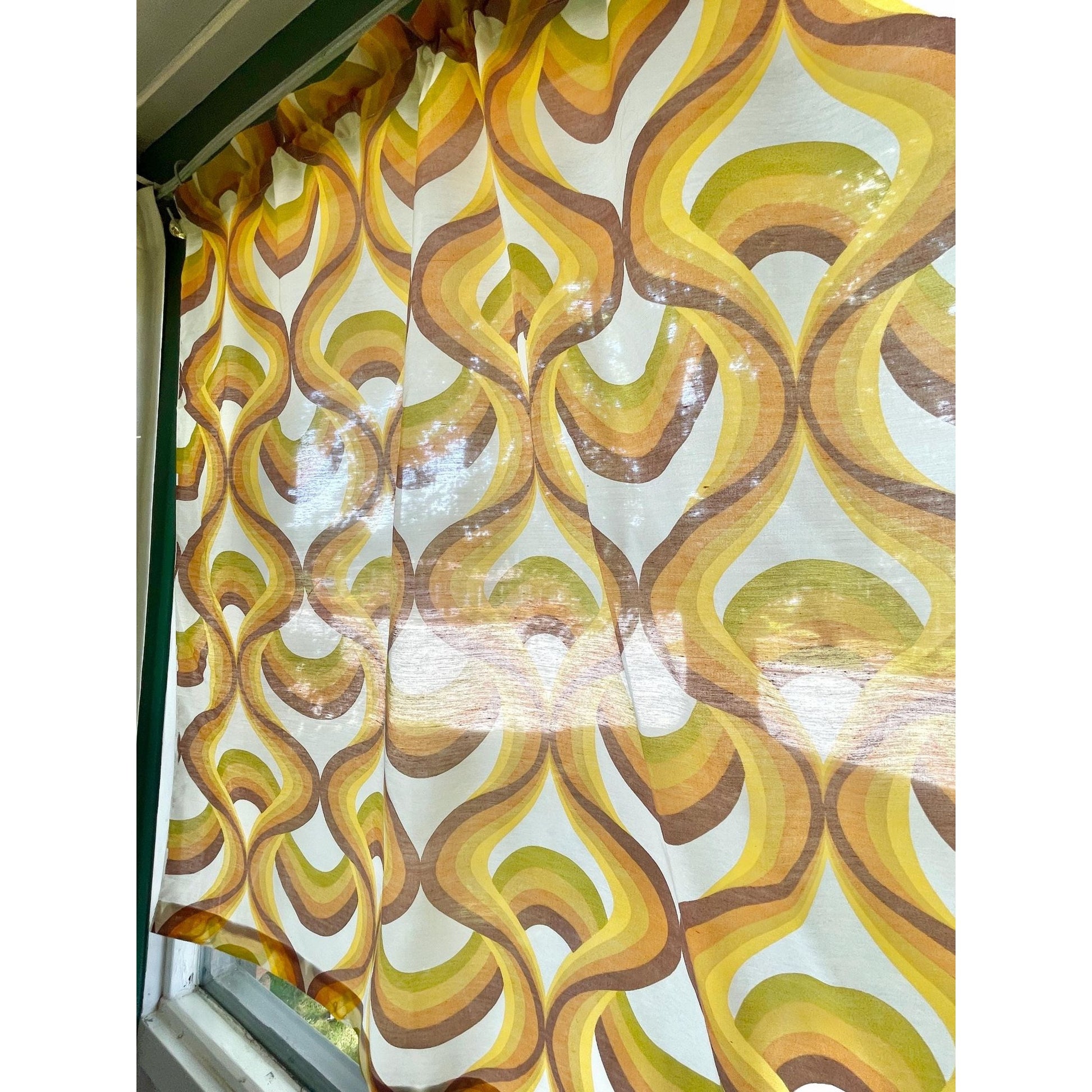 Decorative bold groovy print, in cream, orange, brown, green and yellow, this panel can be hung using a regular size curtain rod.