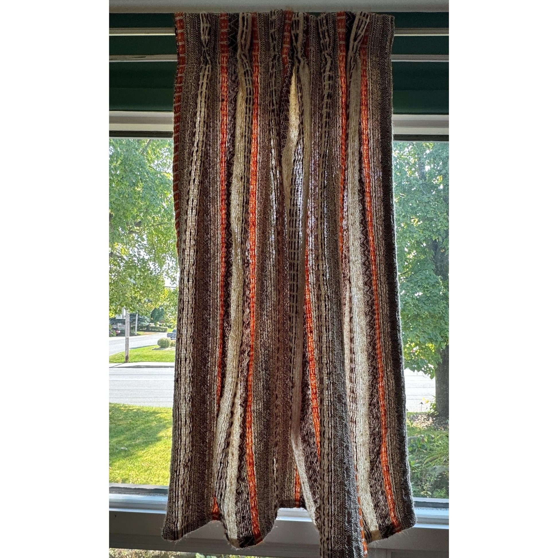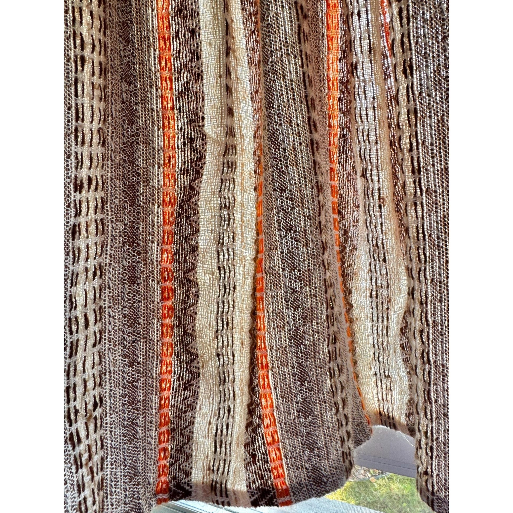It is thick and heavy, large vertical stripes of different brown tones in a geometric pattern, with orange details. The panel is not lined.