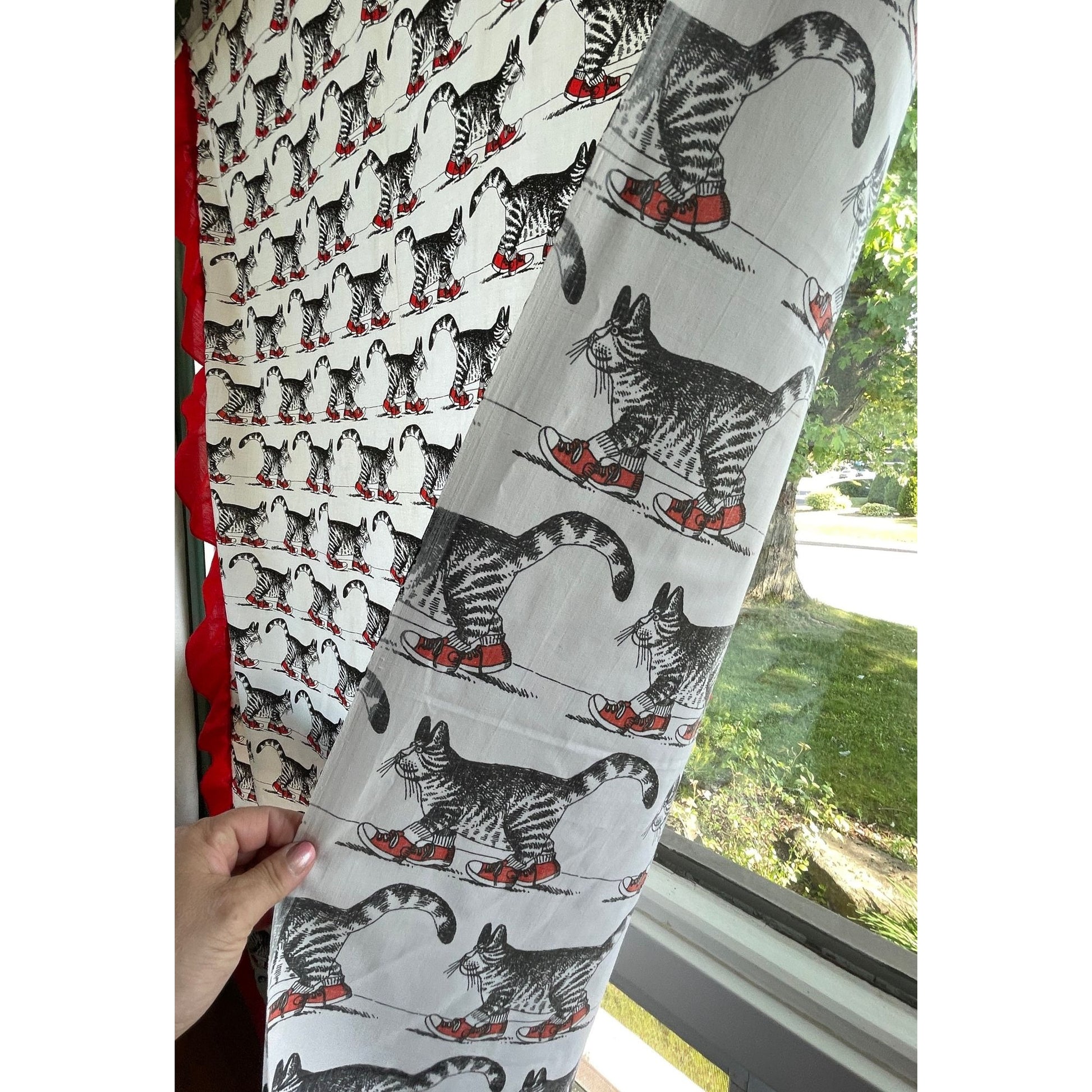 Vintage 70s curtain, Kliban Cat novelty print, cat wearing red shoes, ruffled sides