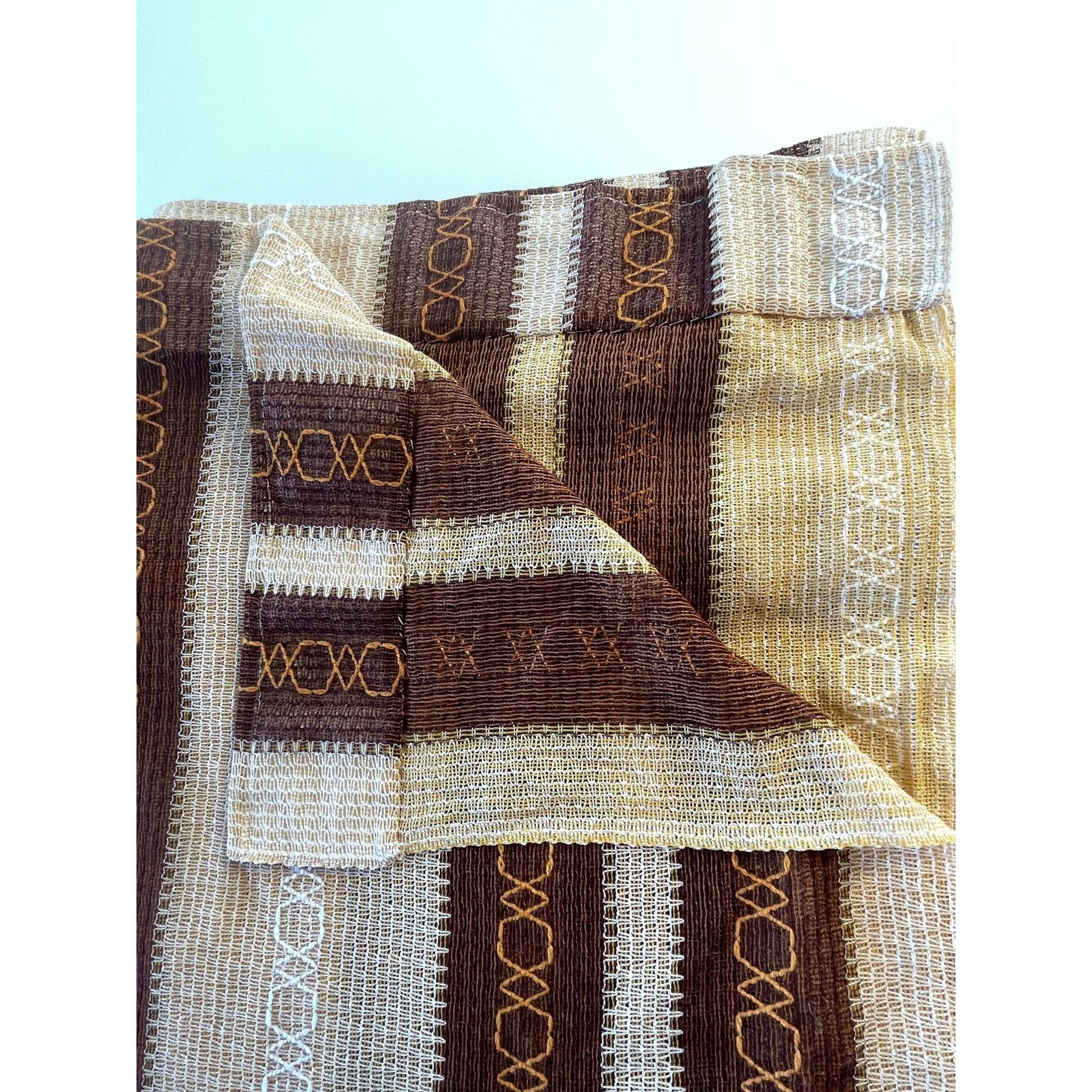 Groovy horizontal stripes in brown and tan, with some orange thread detail.