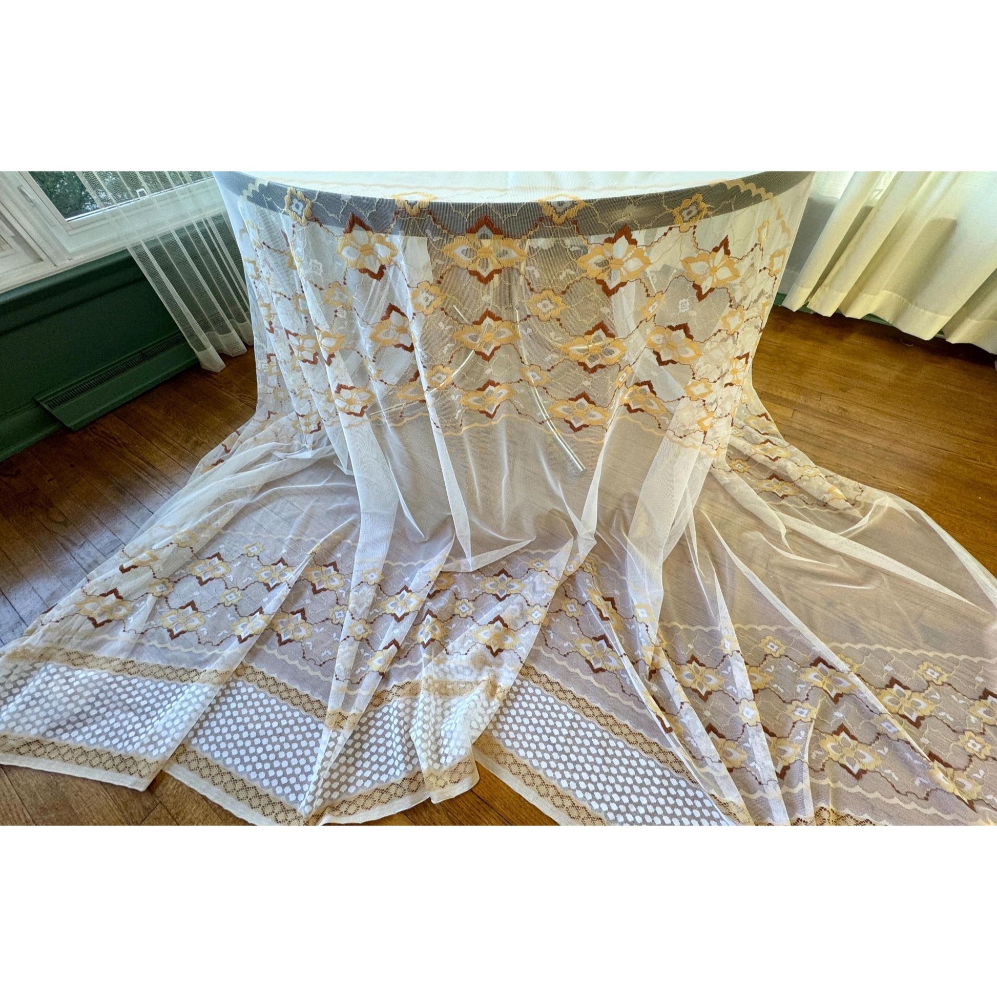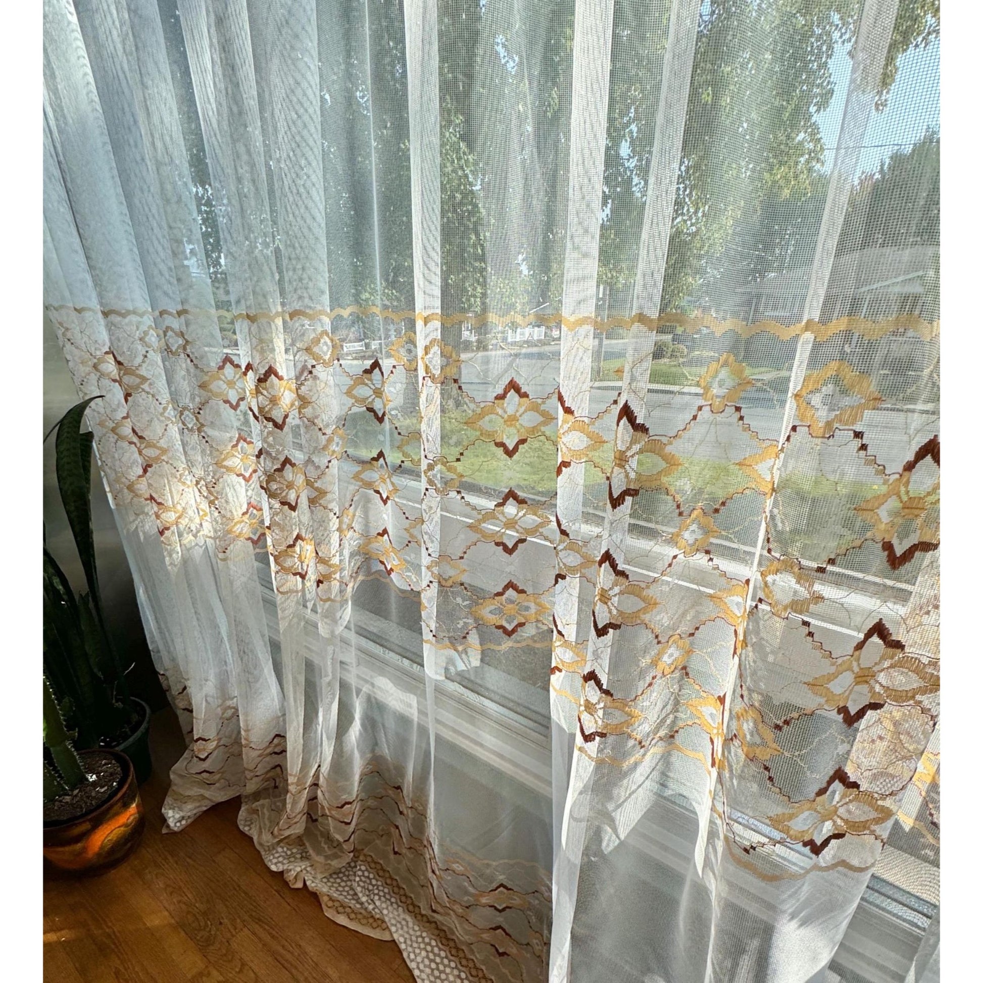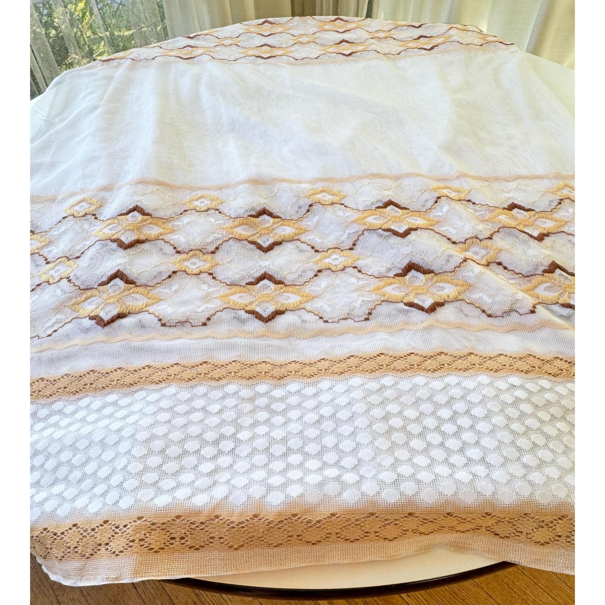 Vintage 70s pleated curtain, white mesh, brown tan embroidered groovy pattern