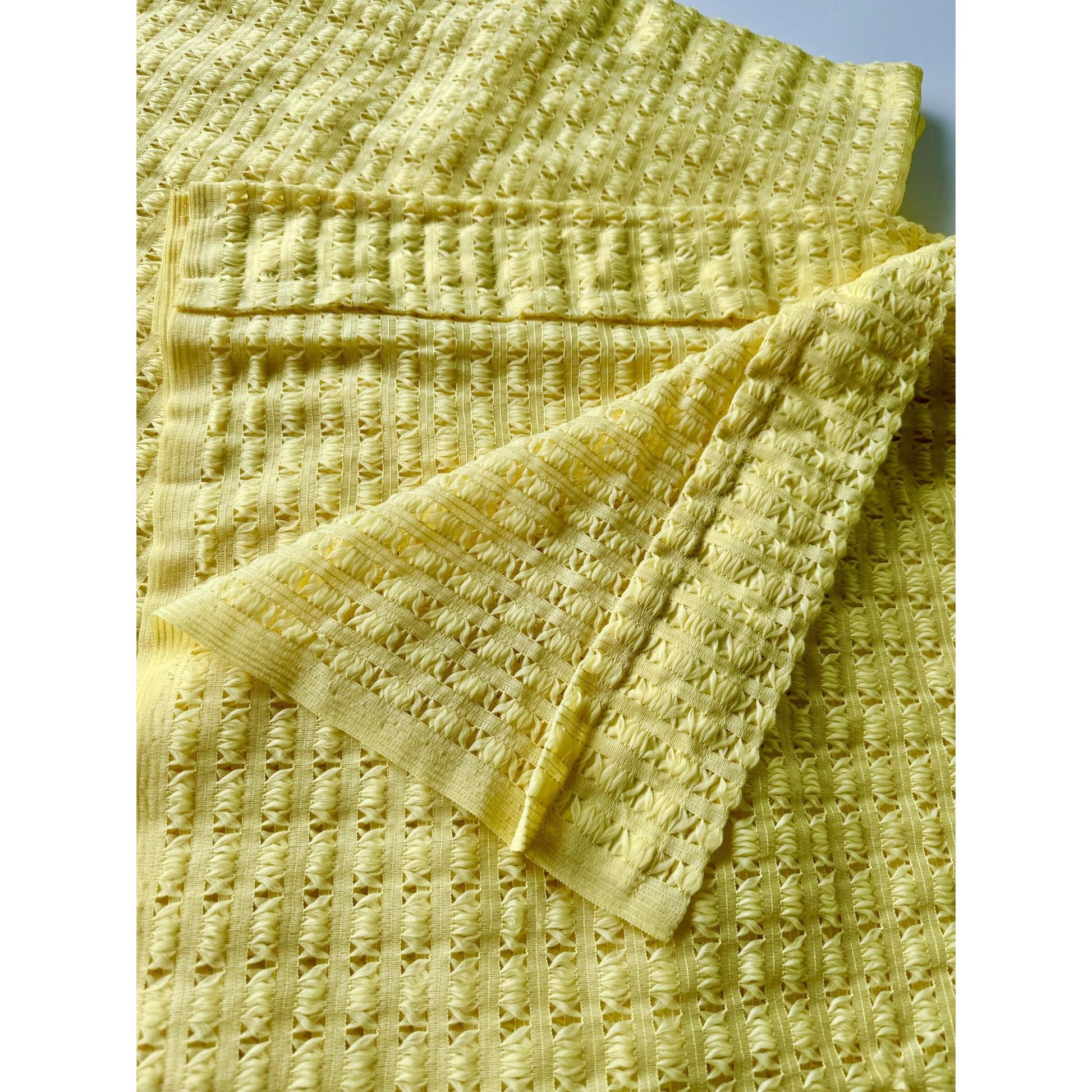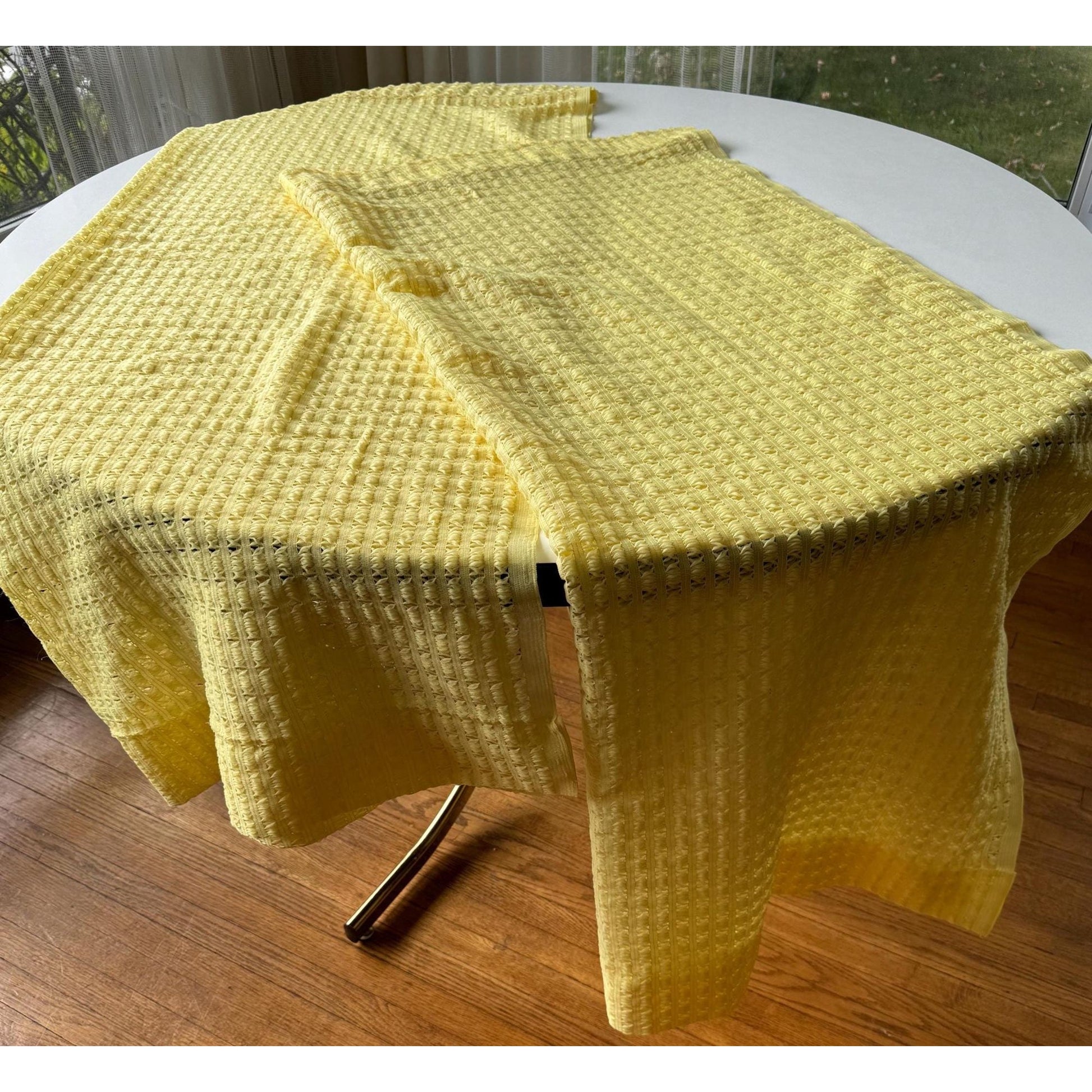 Bright yellow mesh, open weave, nice sheer panel. Would be perfect in a bedroom, bathroom or a basement.