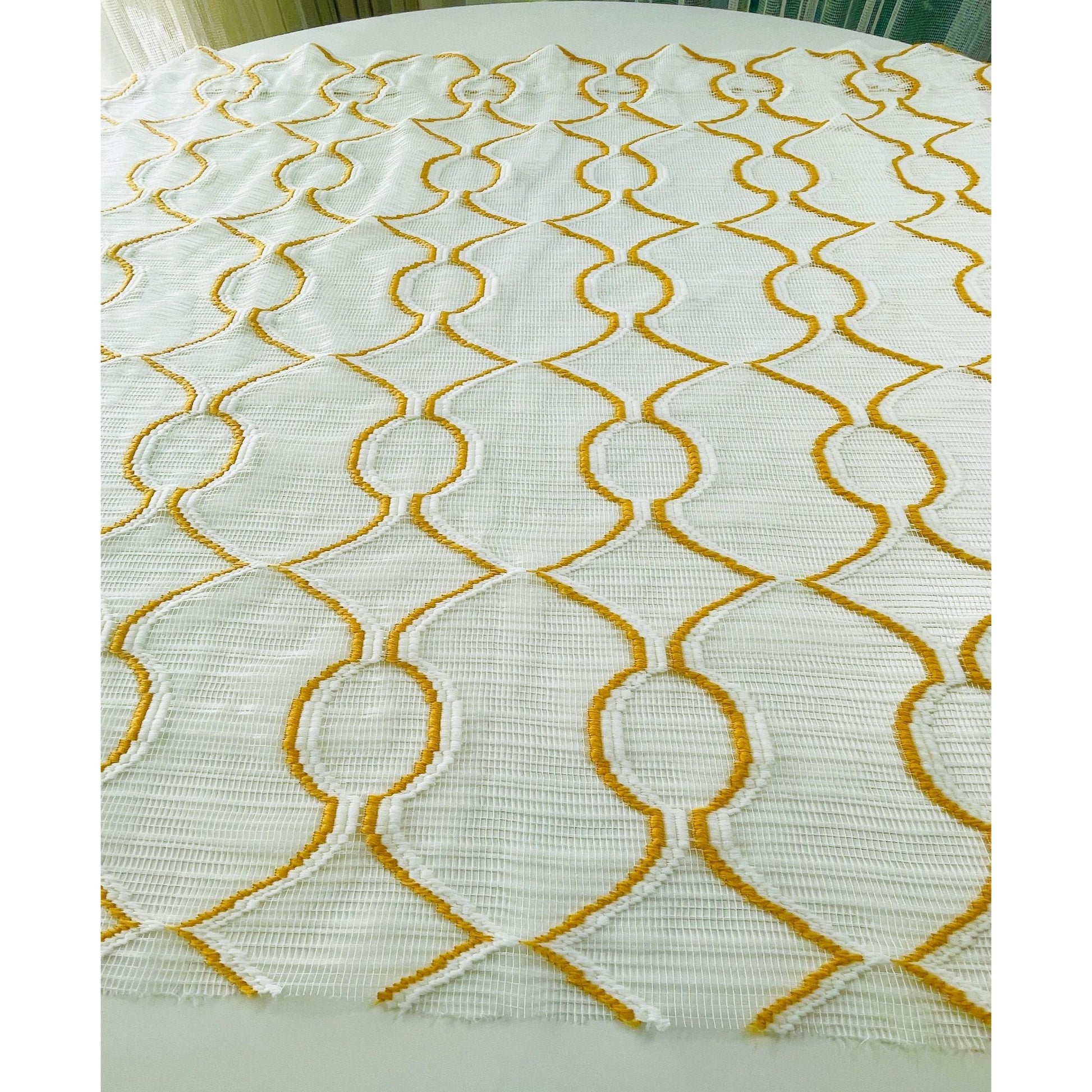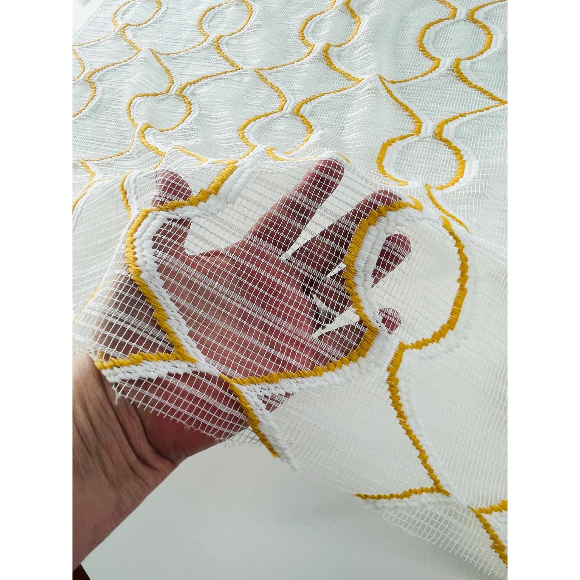 White mesh with vertical geometric embroidered pattern in orangy yellow.