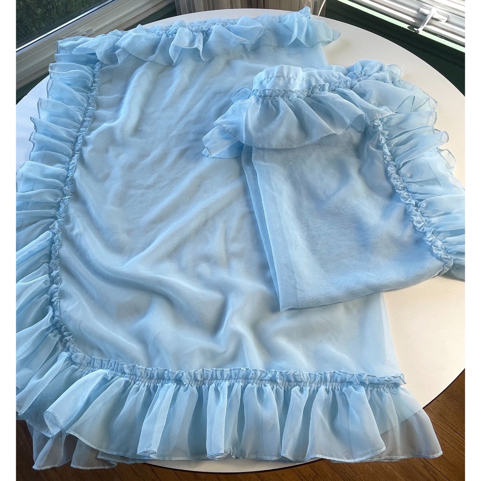 Vintage 70s curtain, sheer blue ruffled with tiebacks