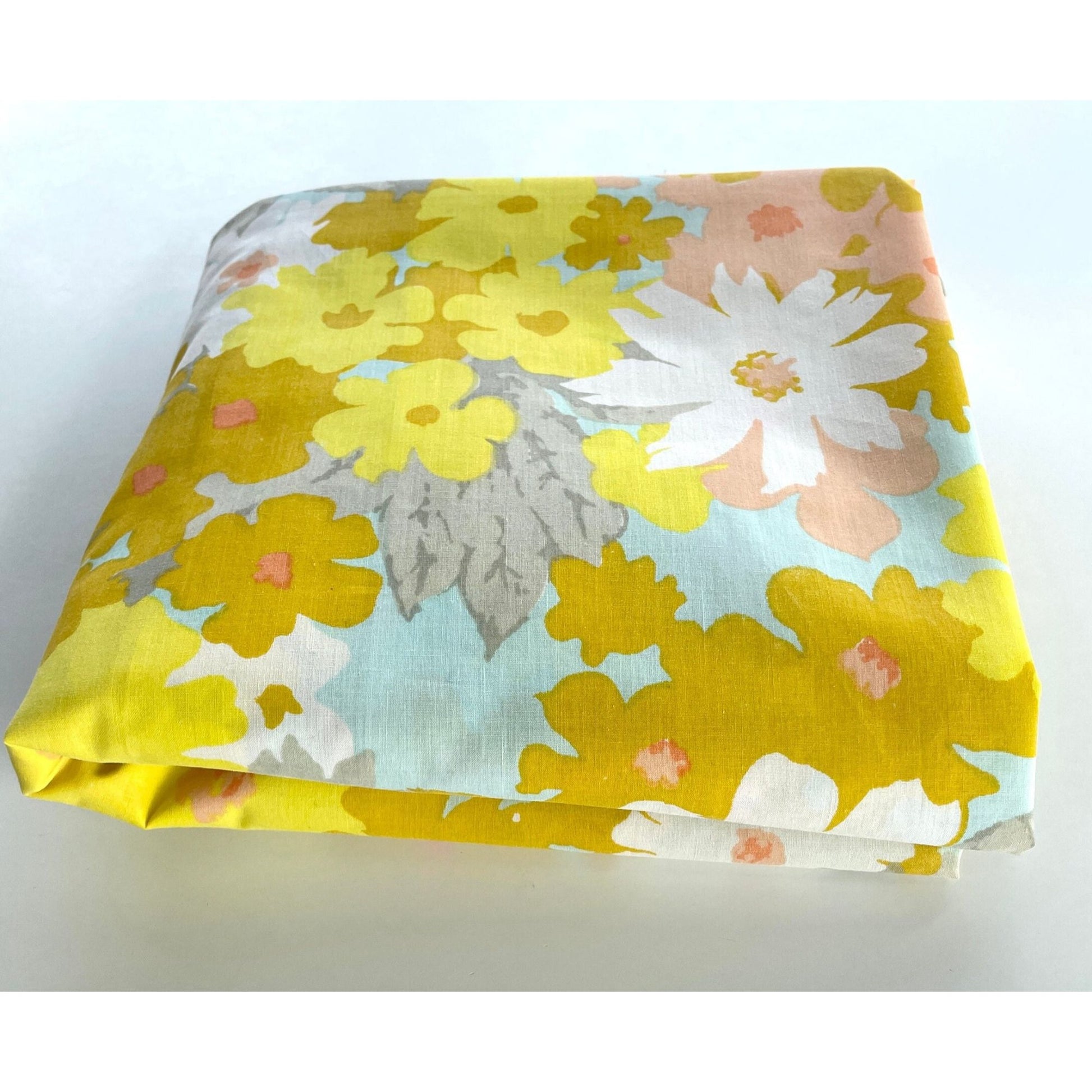 absolutely lovely flower power pattern, yellow, orange over a blue backgroud.
