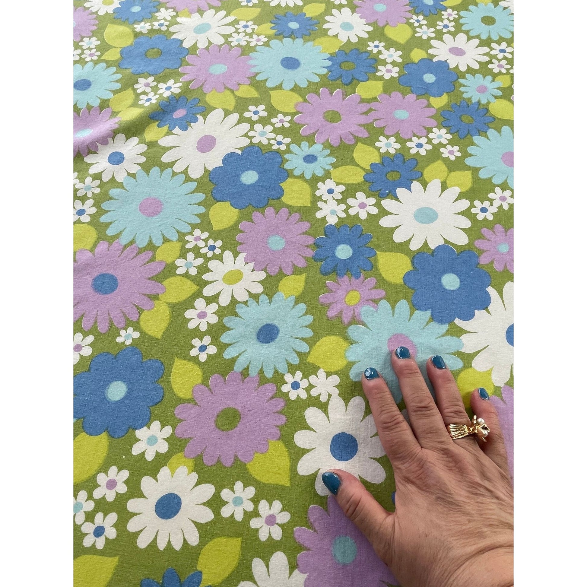 Large and bold daisies in iconic 70s colors such as avocado green, blue and pink; floral white piping.