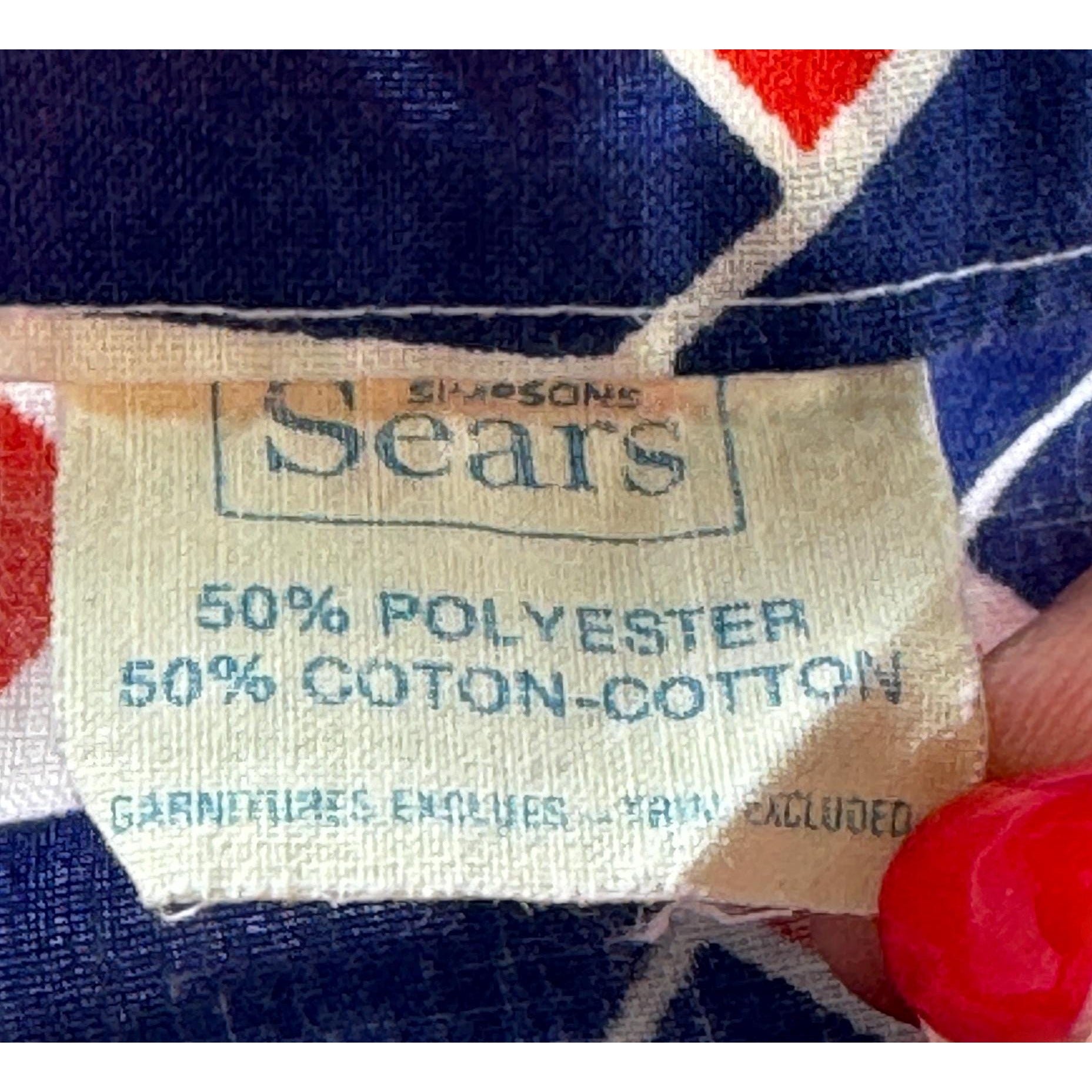 Vintage 70s flat / top sheet, geometric red white and blue shapes, twin size bed, Simpson Sears