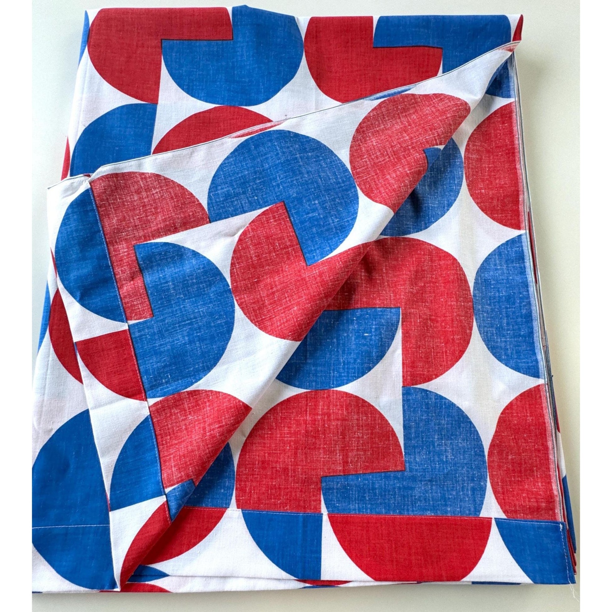 Vintage 70s flat / top sheet, geometric red white and blue, double/full size bed, Texmade