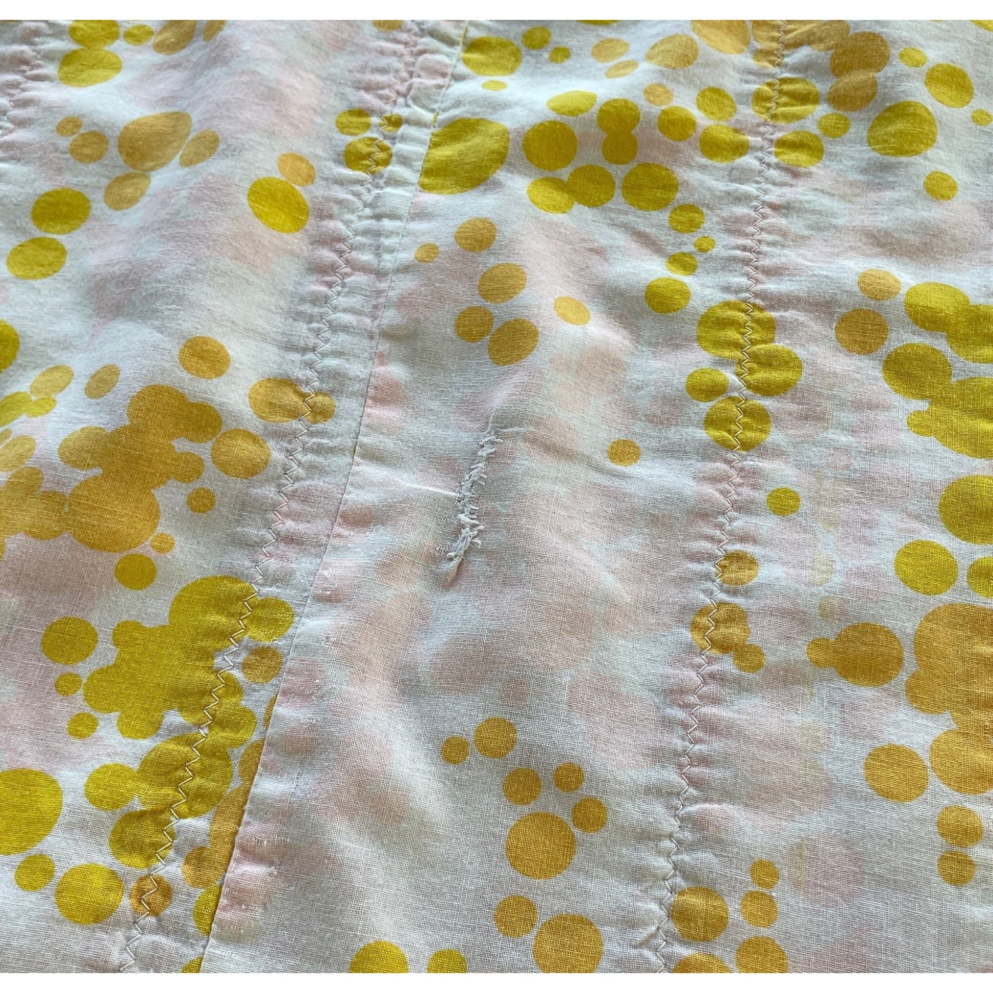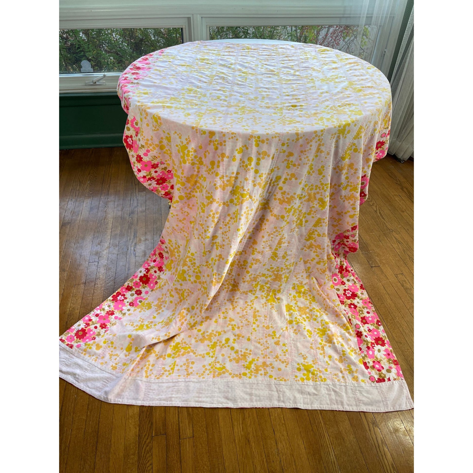 this quilt was handmade in the 70s, using fabulous fabric from that era with absolutely fantastic colors.