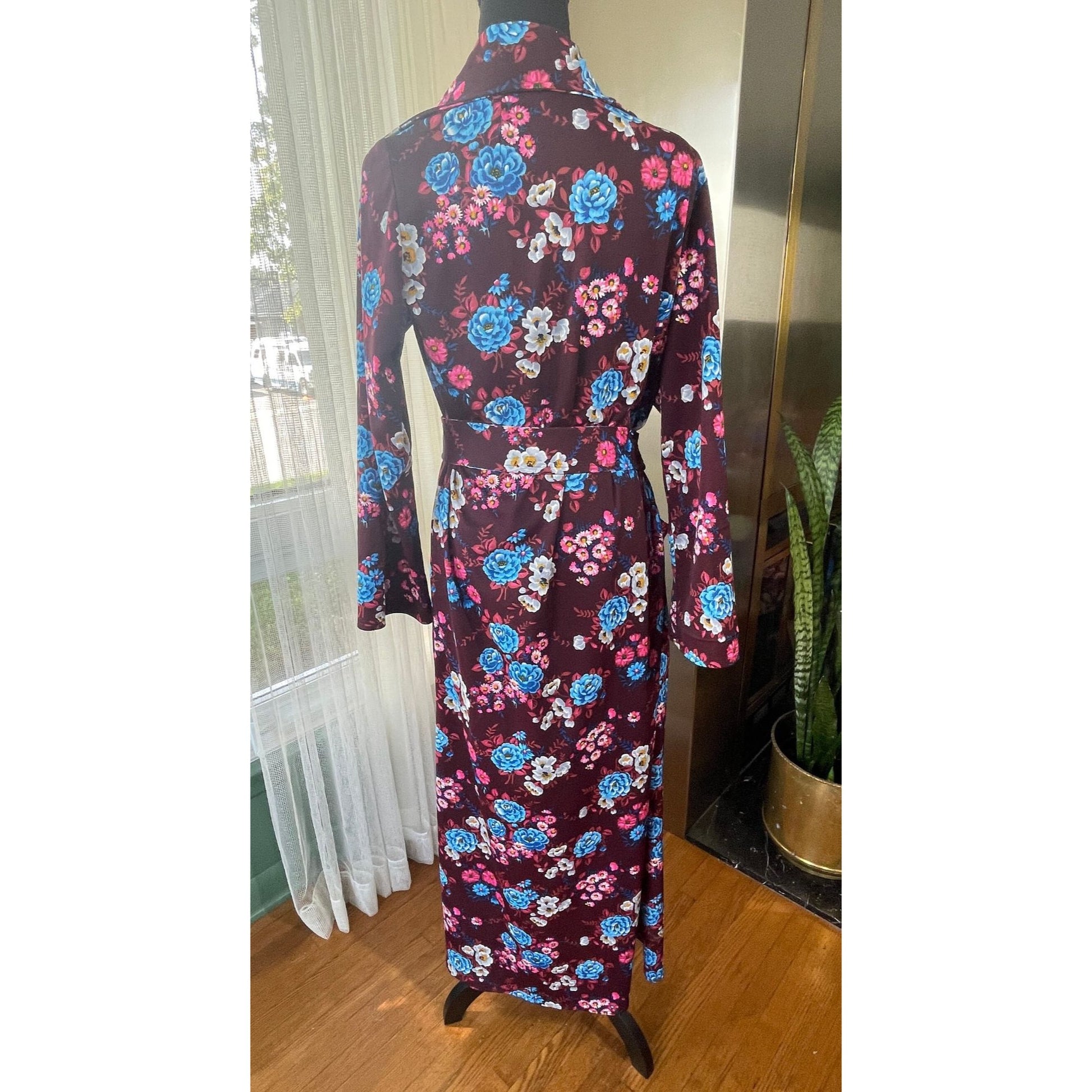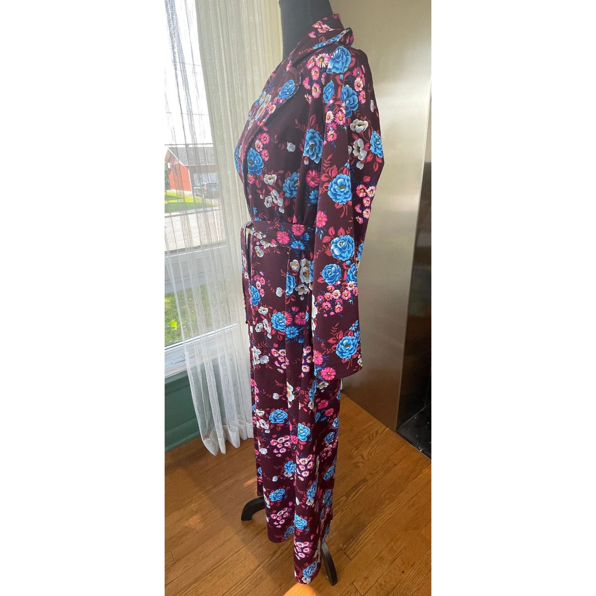gorgeous burgundy wrap around robe, it has large floral blue and pink print, with a pocket on the side. material is somewhat stiff with some stretch, likely a double knit jersey. includes an assorted tie belt.