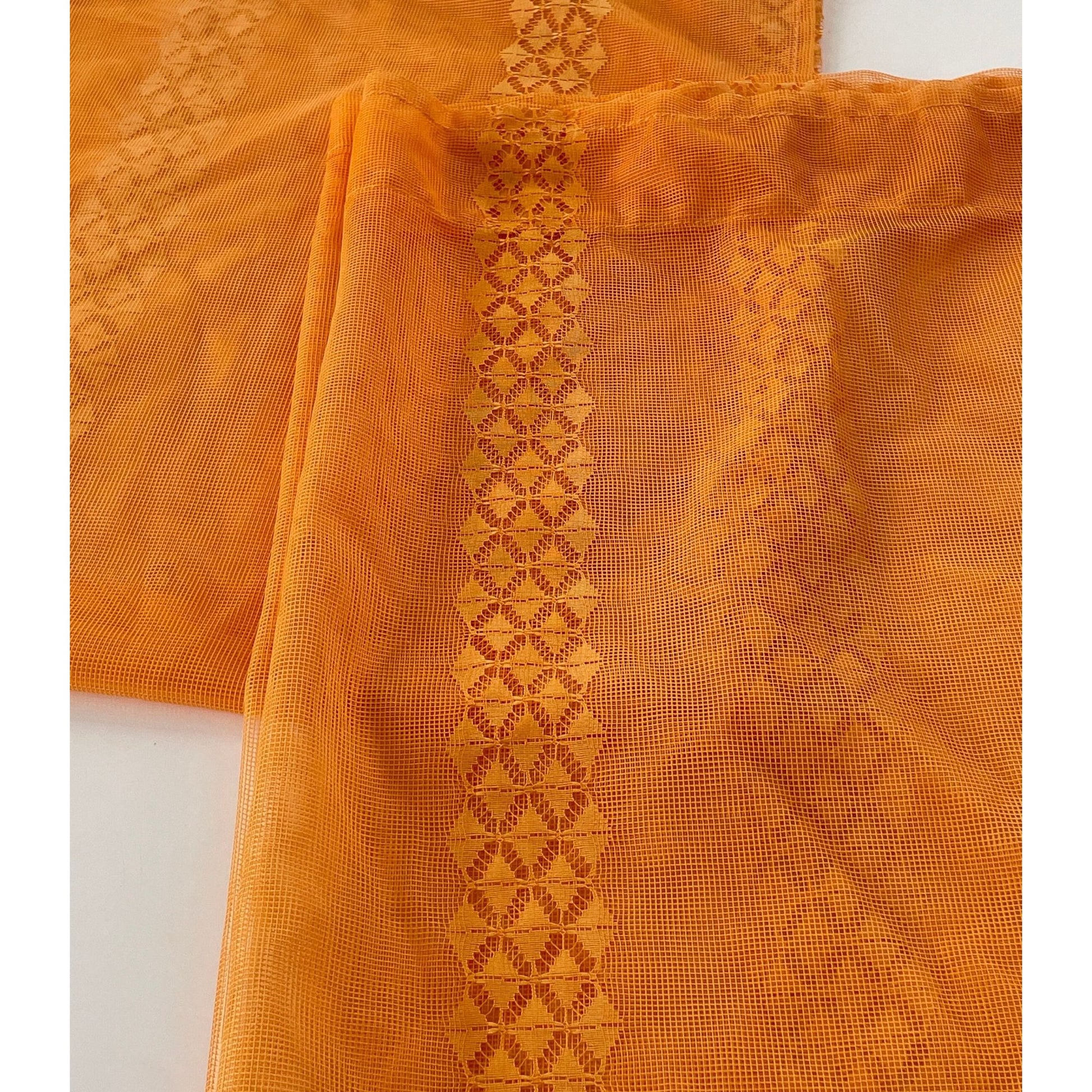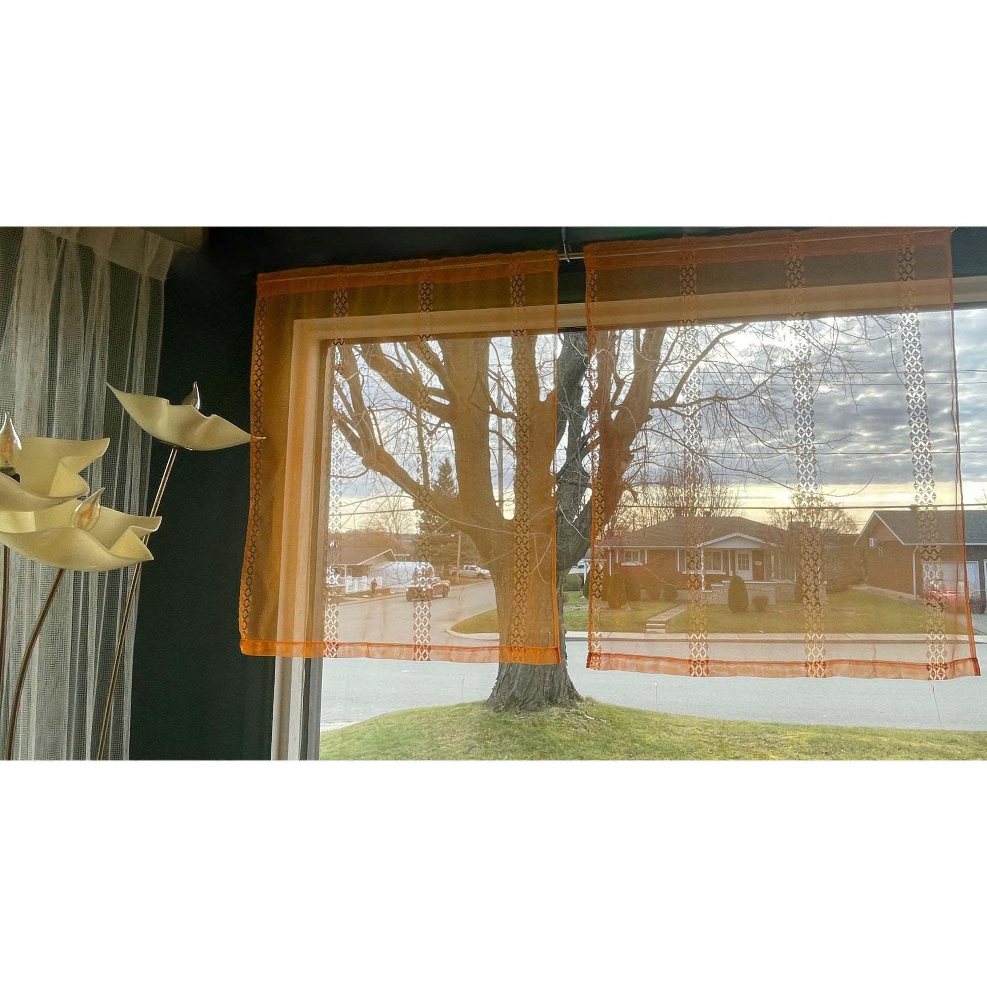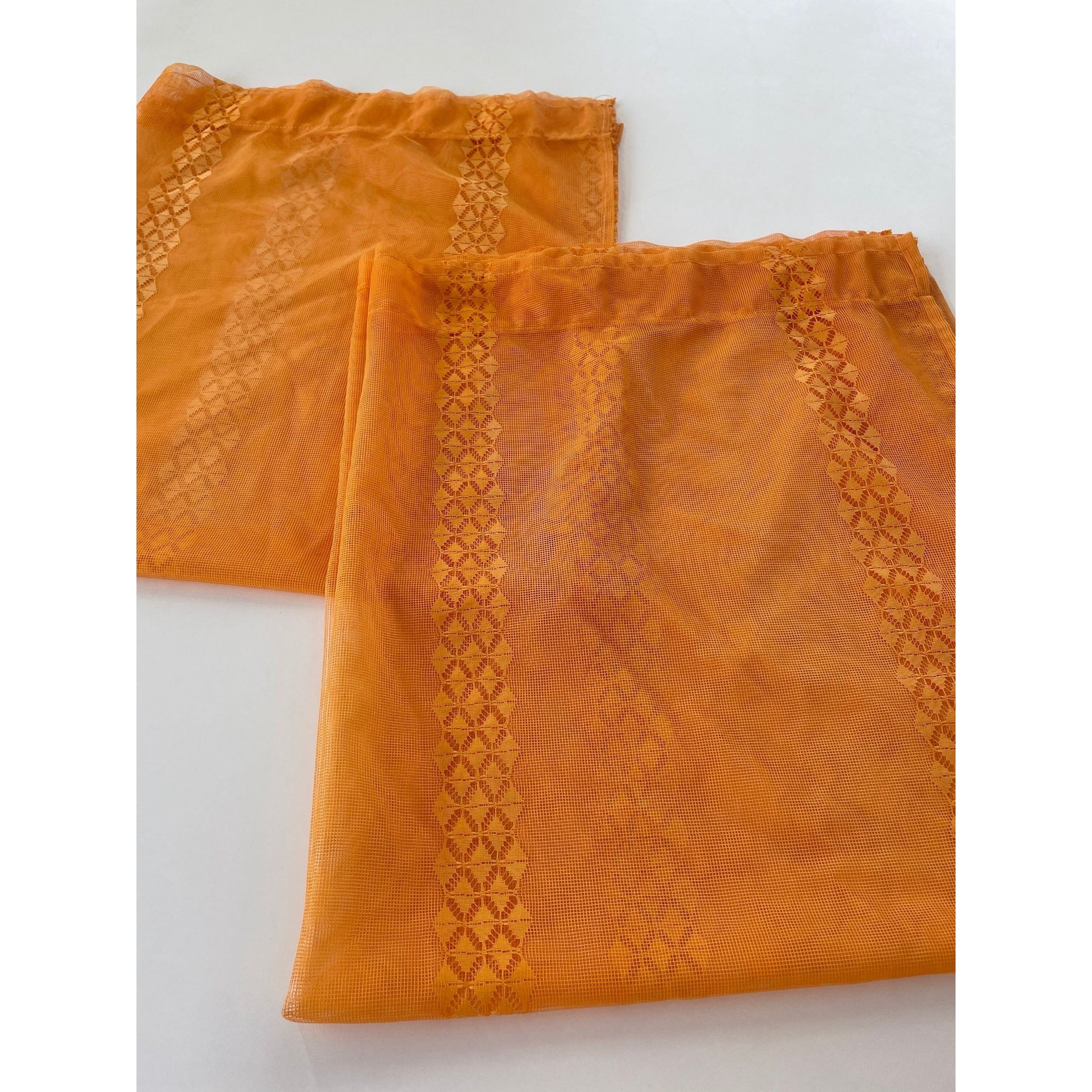 Geometric vertical stripes pattern, sheer. Color is a nice soft orange, please note that the color is difficult to render with my phone camera and might differ slightly.