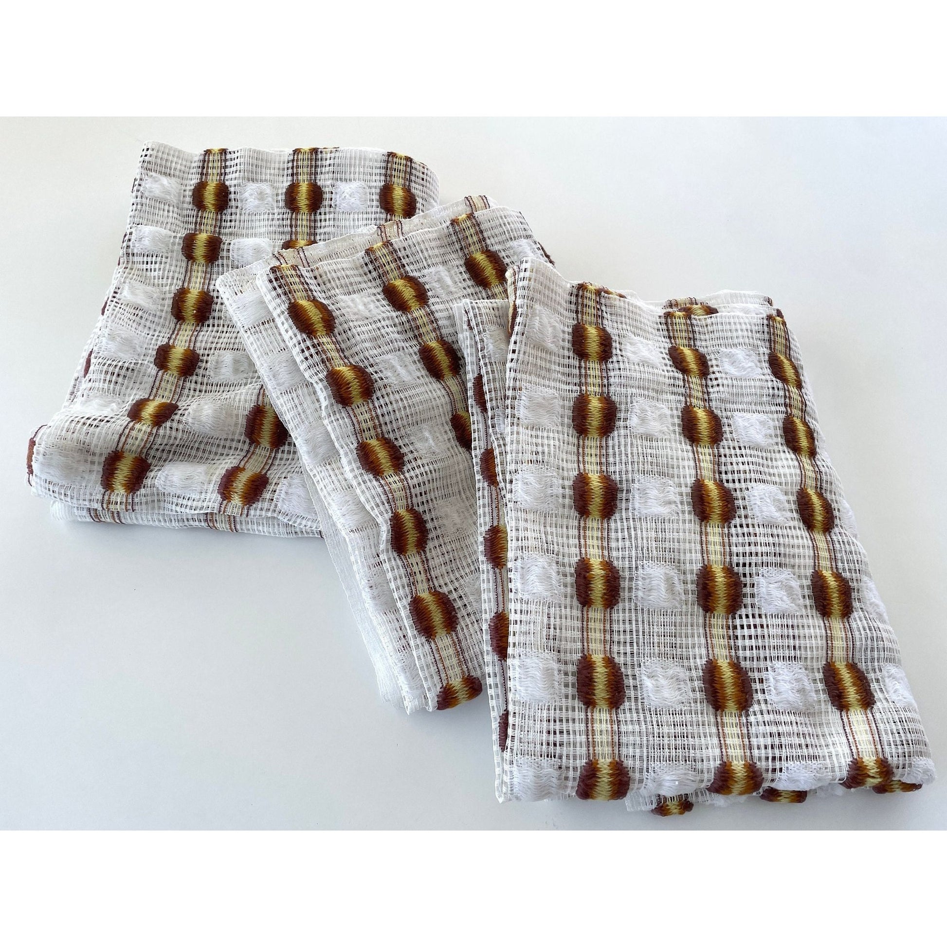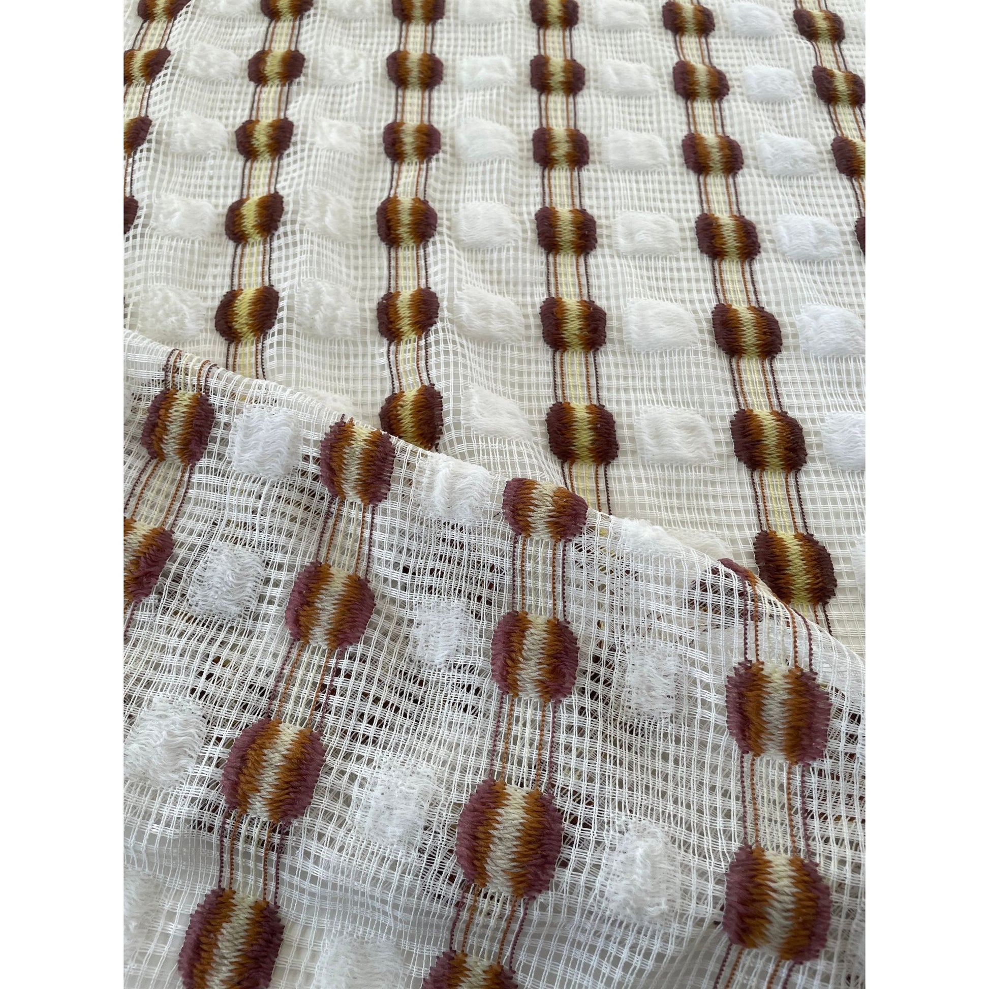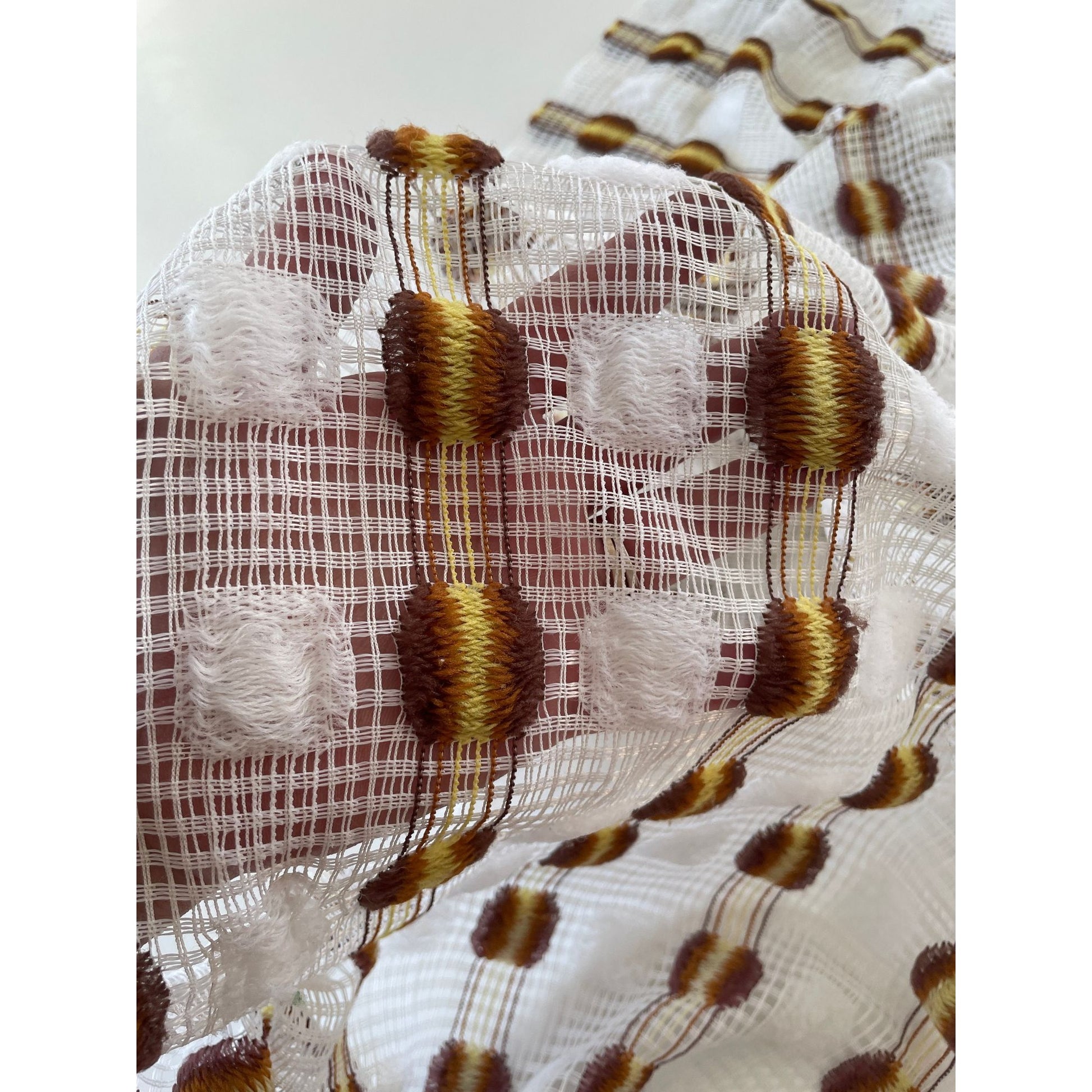 White mesh with vertical stripes and fluffy embroidered details in orange and yellow with a brown touch.