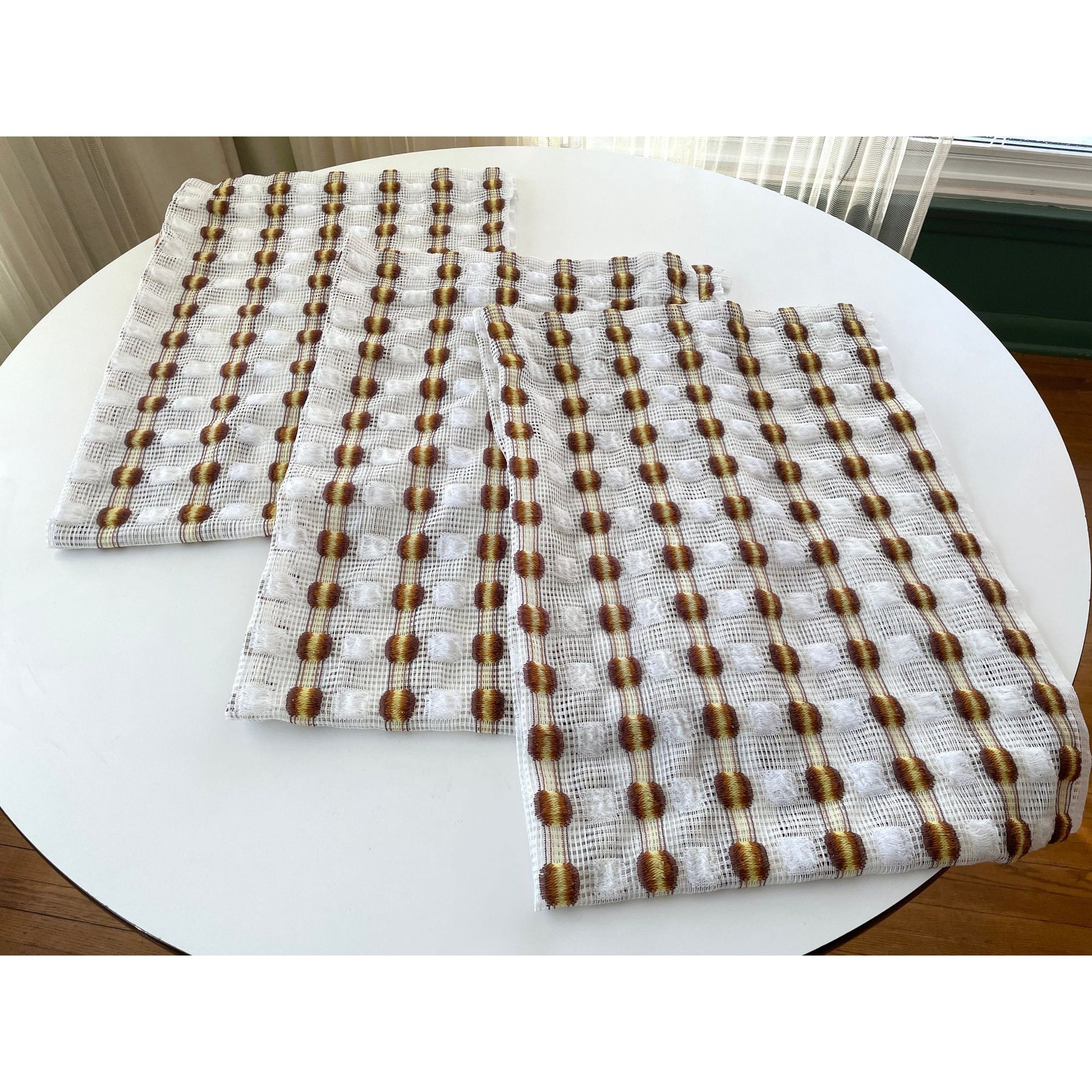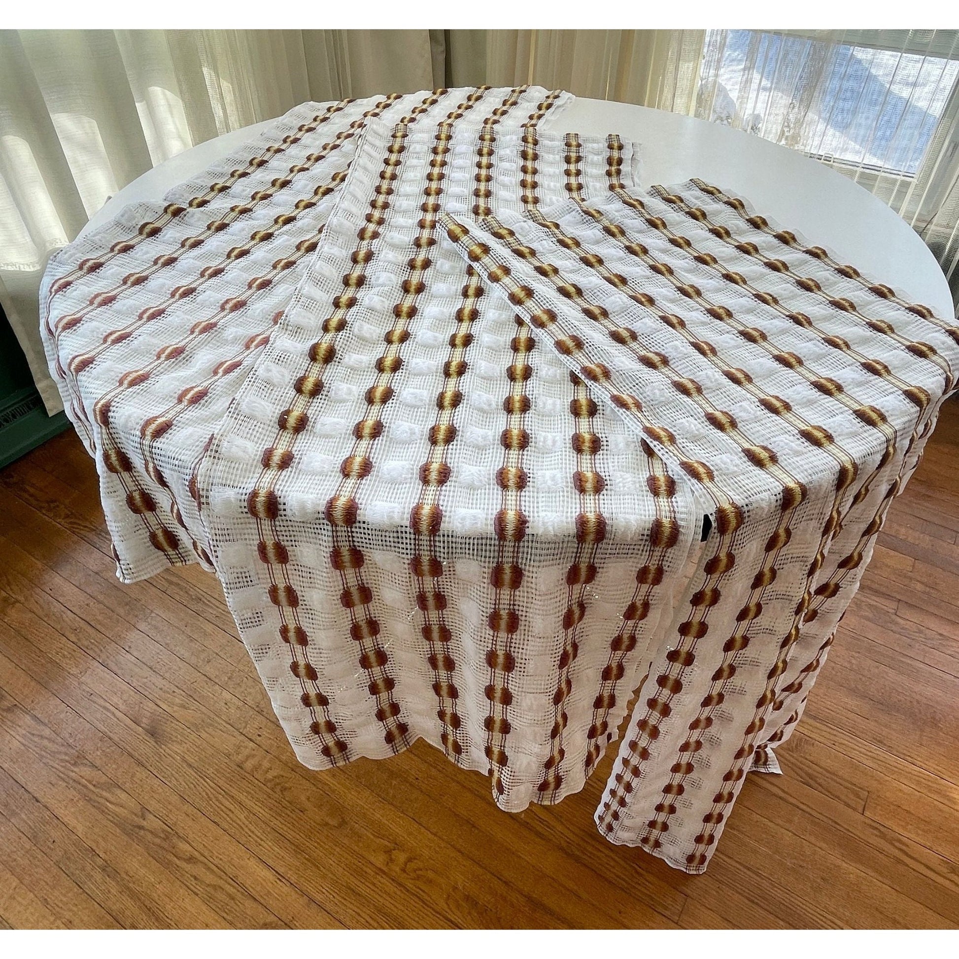 Vintage 70s curtain, white, orange yellow, fluffy mesh panel