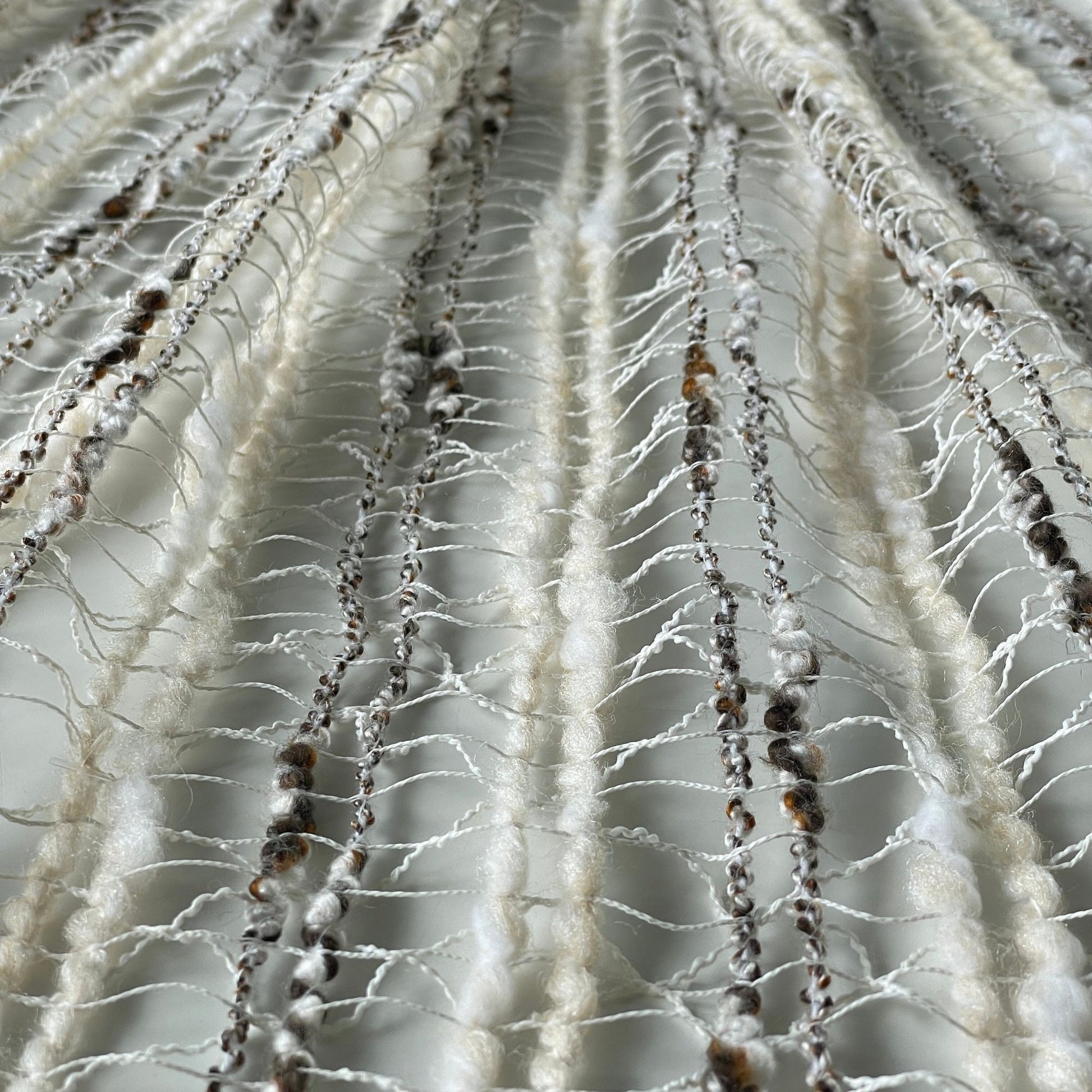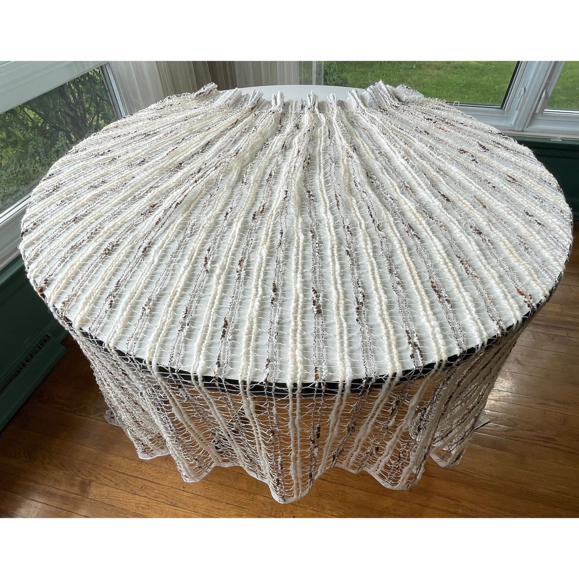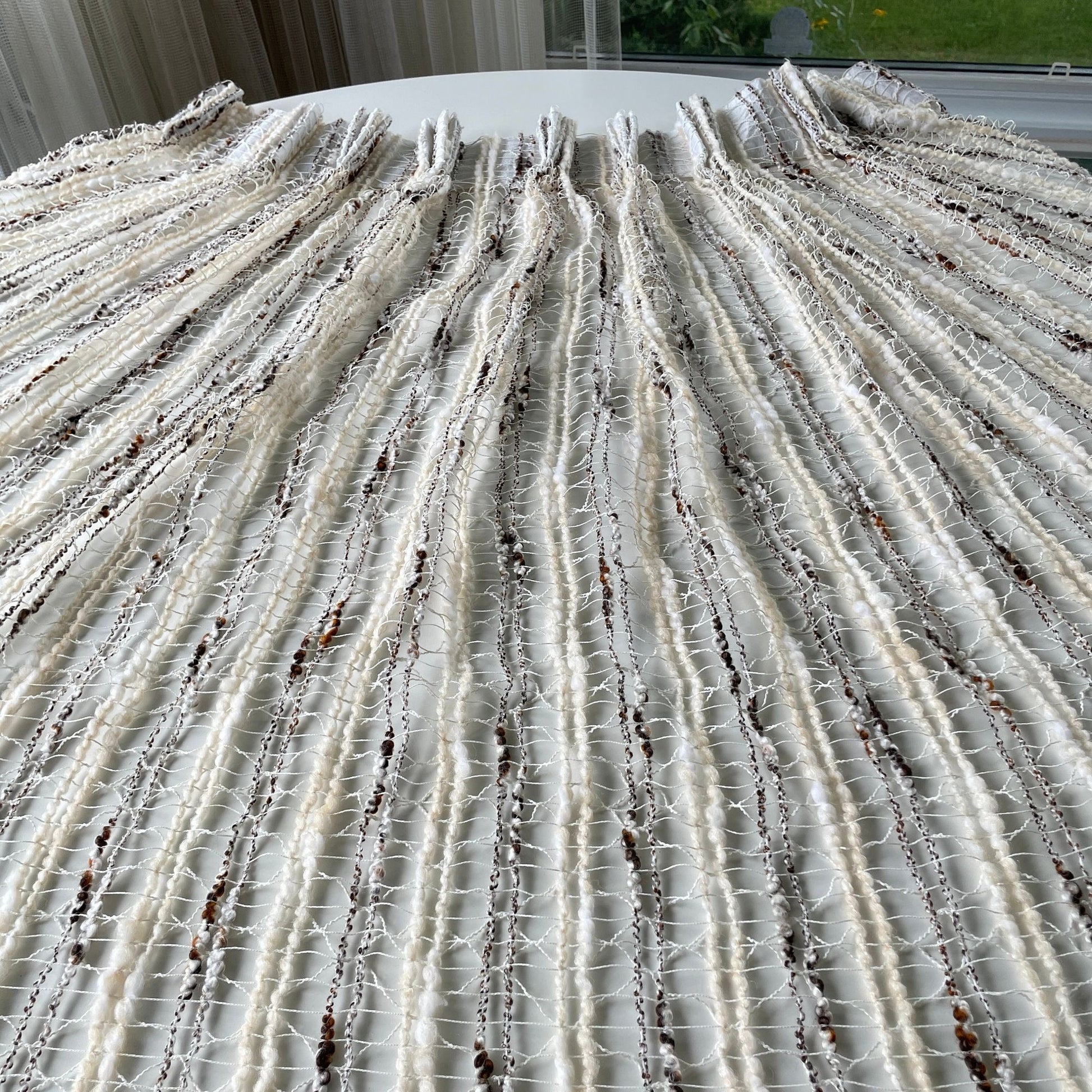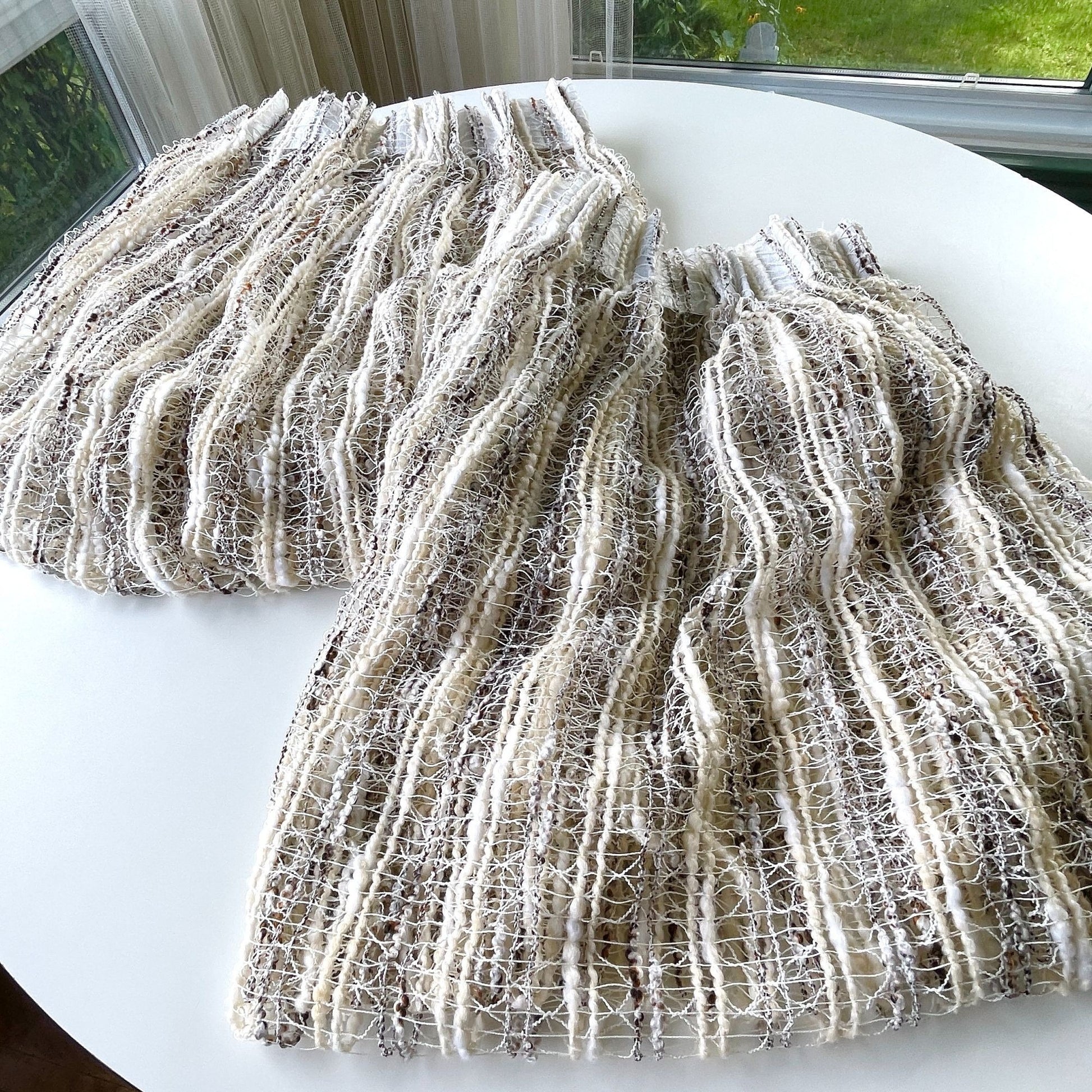 Stunning! Vintage 70s woven white, tan and brown curtains panels; sold as a pair.
