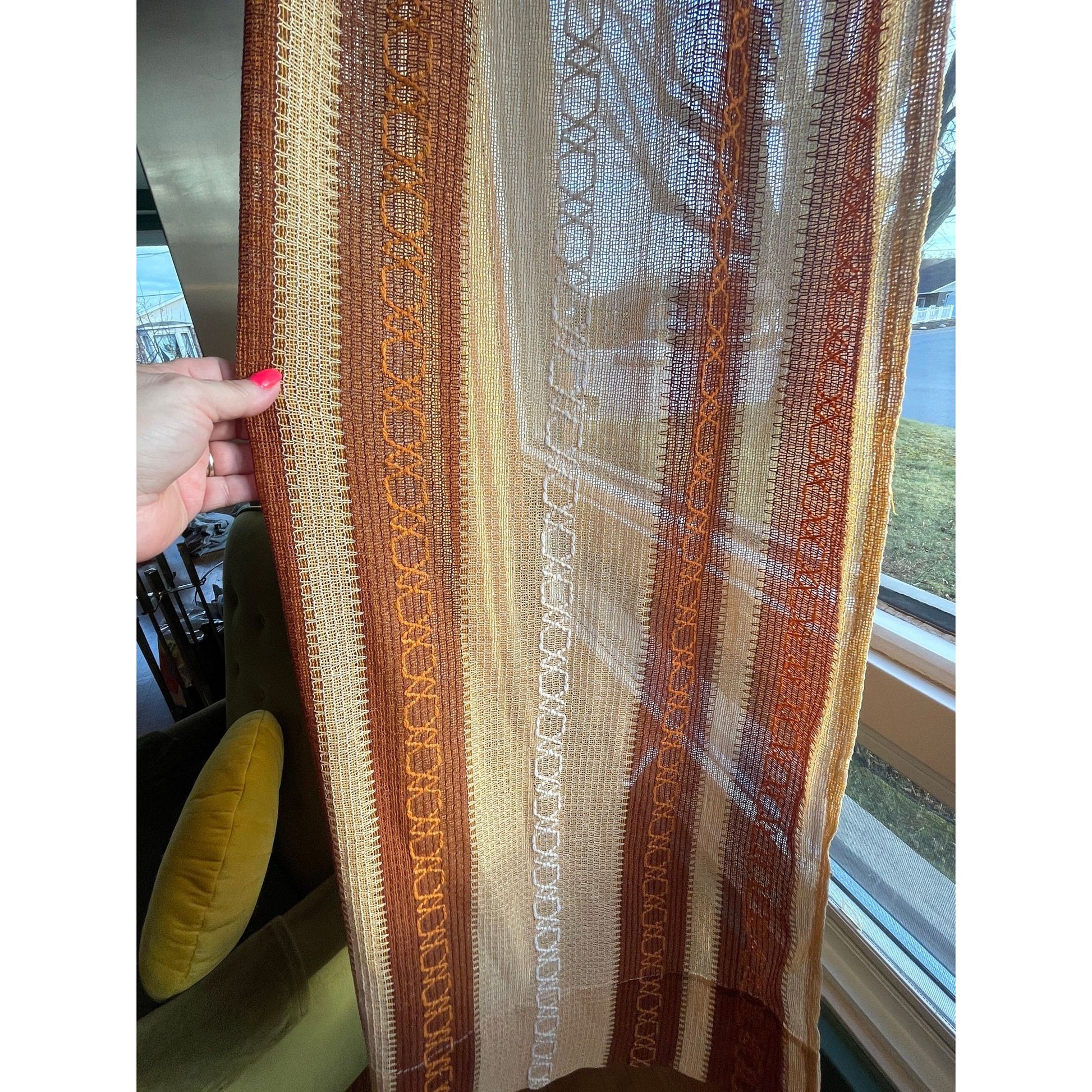 Vintage 70s net woven pleated curtains, brown stripes
