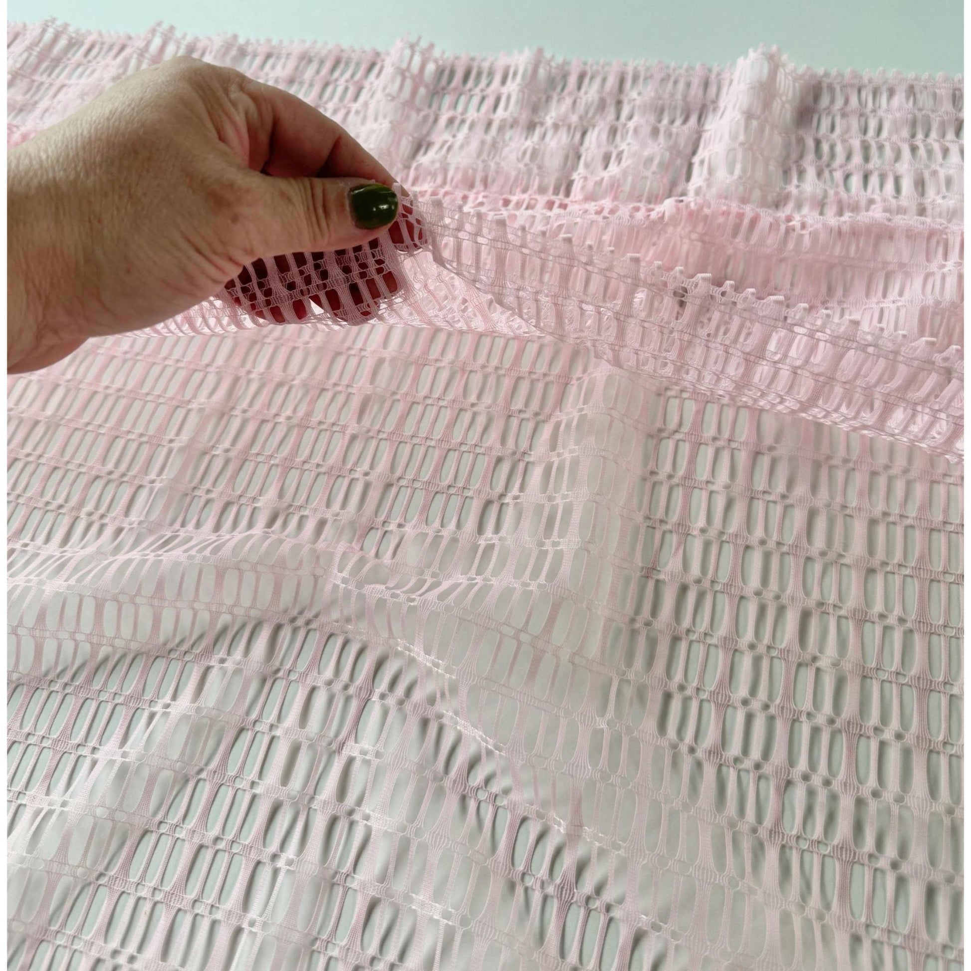 Vintage 70s wide mesh net curtain, soft bubblegum pink. Price is for one panel, two are available.