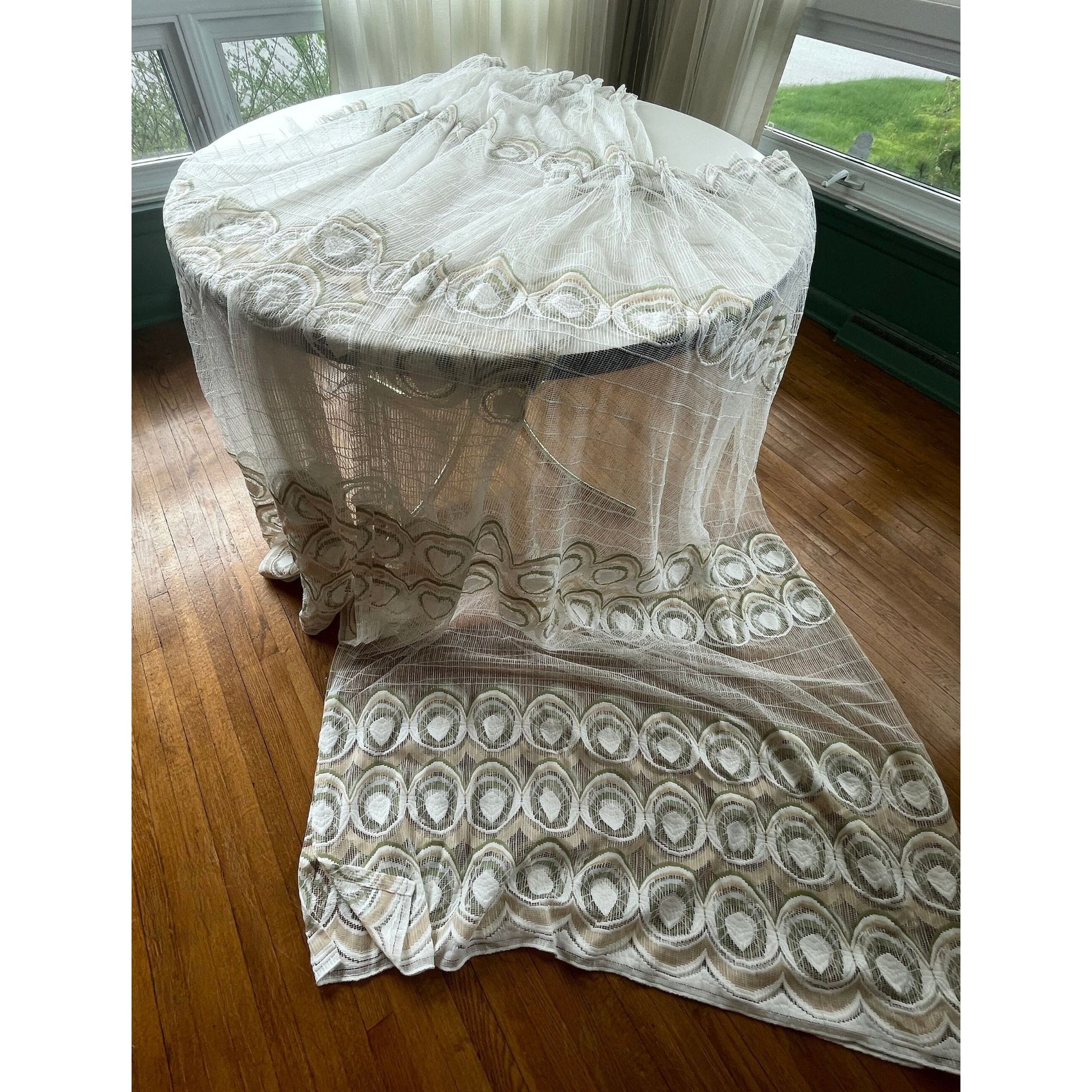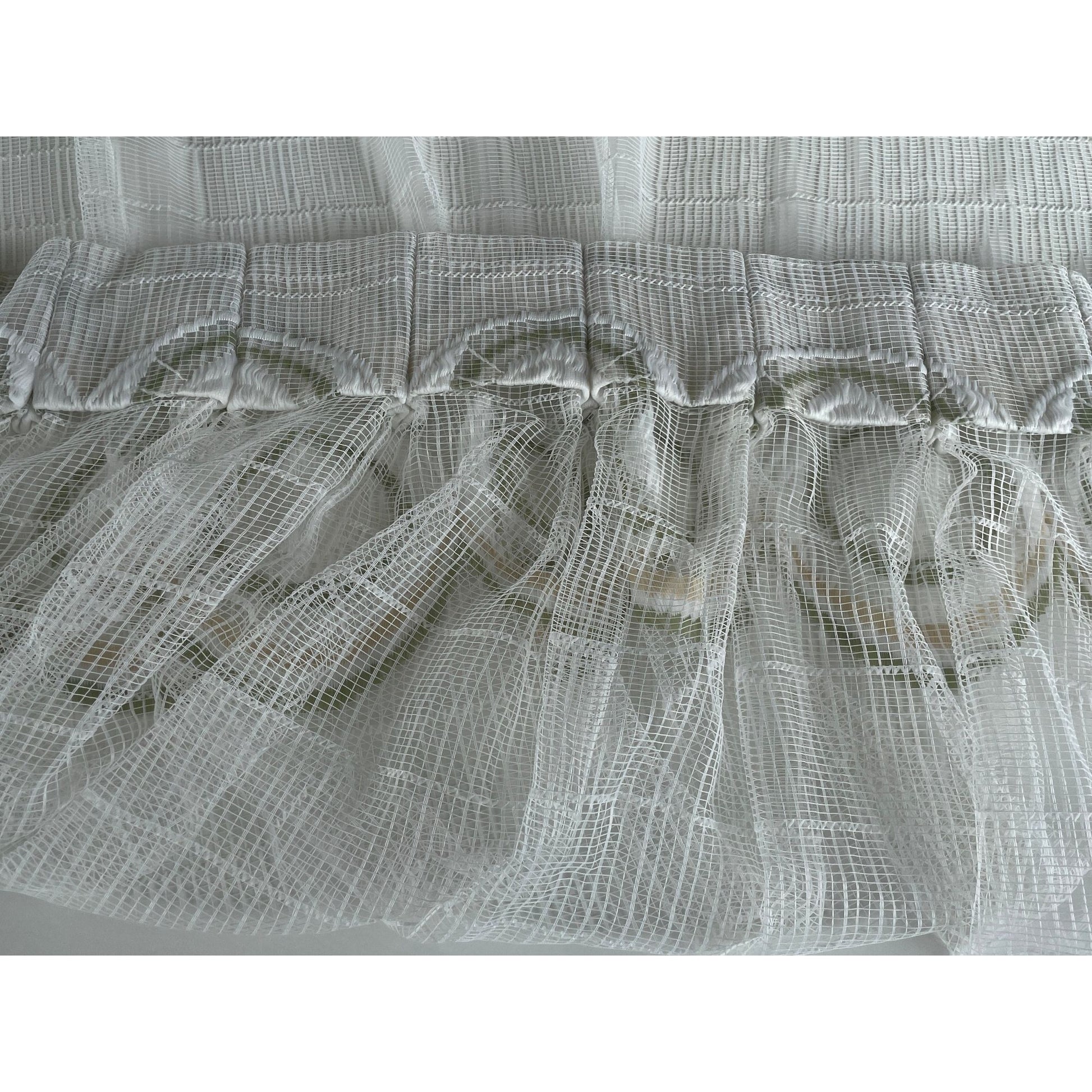 Vintage 70s pleated curtain, white with green and yellow groovy pattern