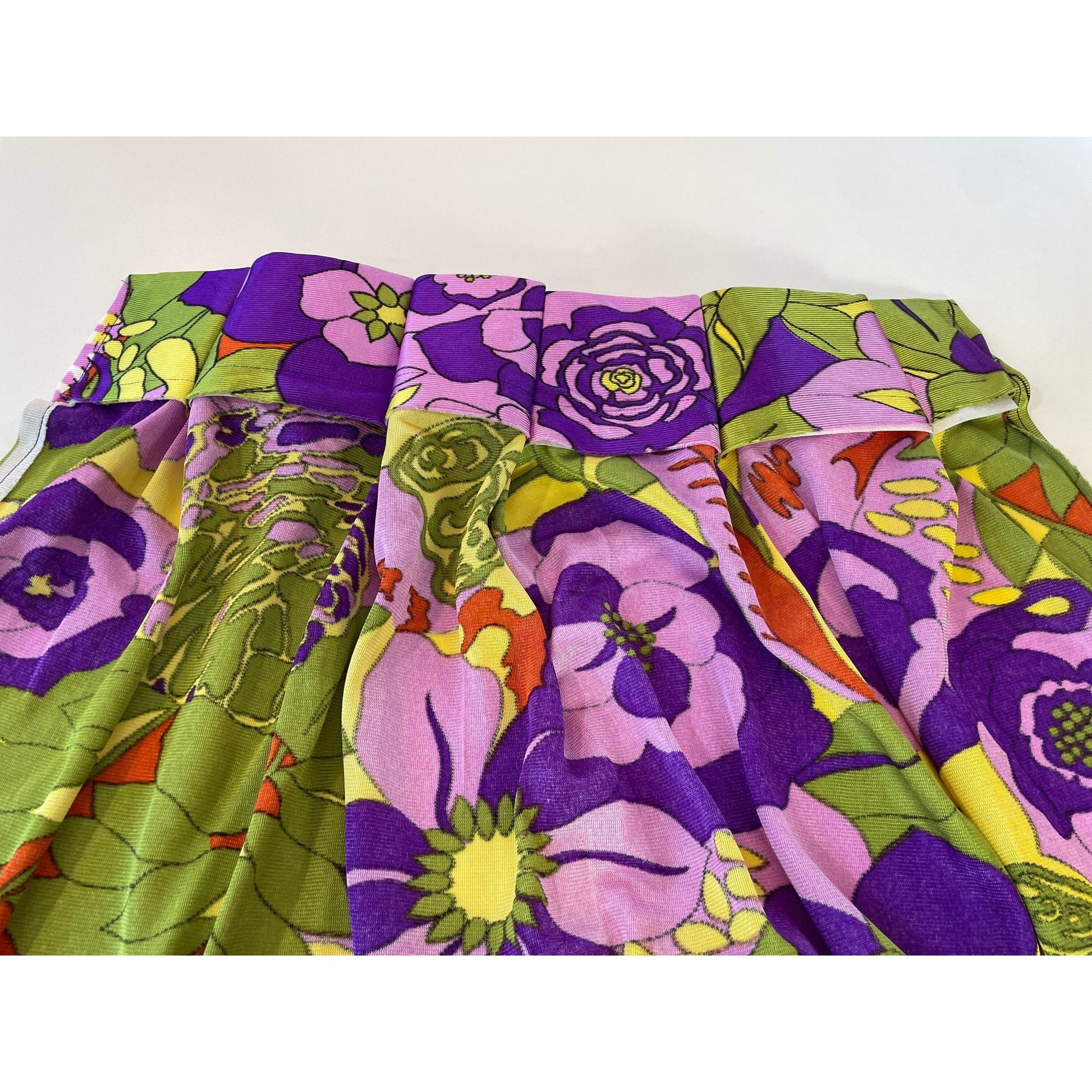Vibrant floral funky pattern with groovy bold colors: purple, pink, green, yellow and orange. Perfect 1970s psychedelic vibe!