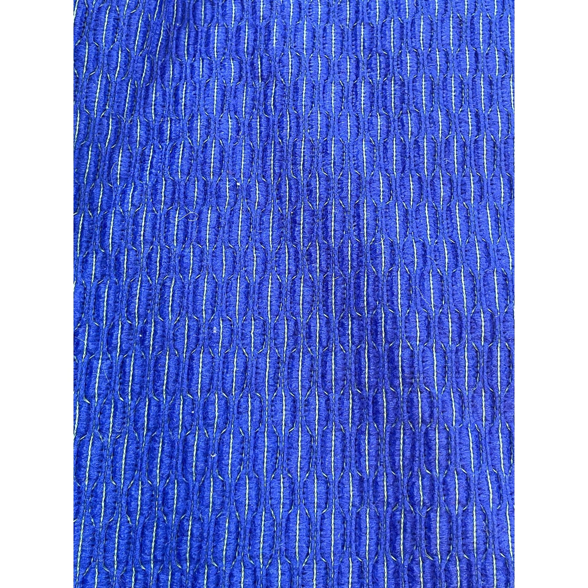 Swag with an asymmetrical cut, longer on each side, thick fabric in deep blue color, this valance has a pom pom fringe at the bottom in white.