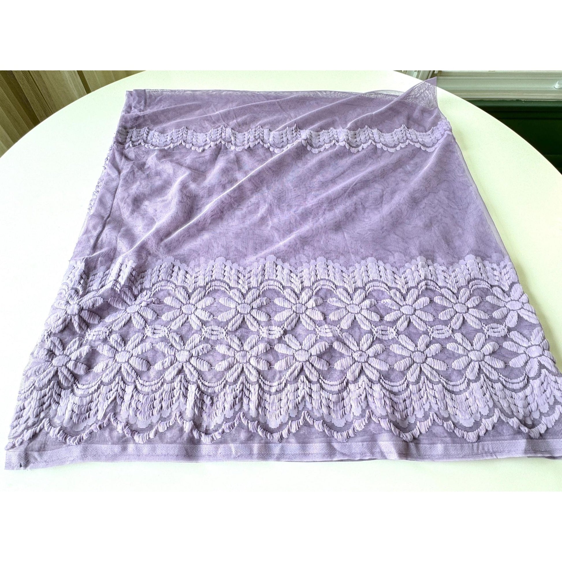 Purple/lilac mesh with gorgeous wavy fluffy daisy floral pattern.