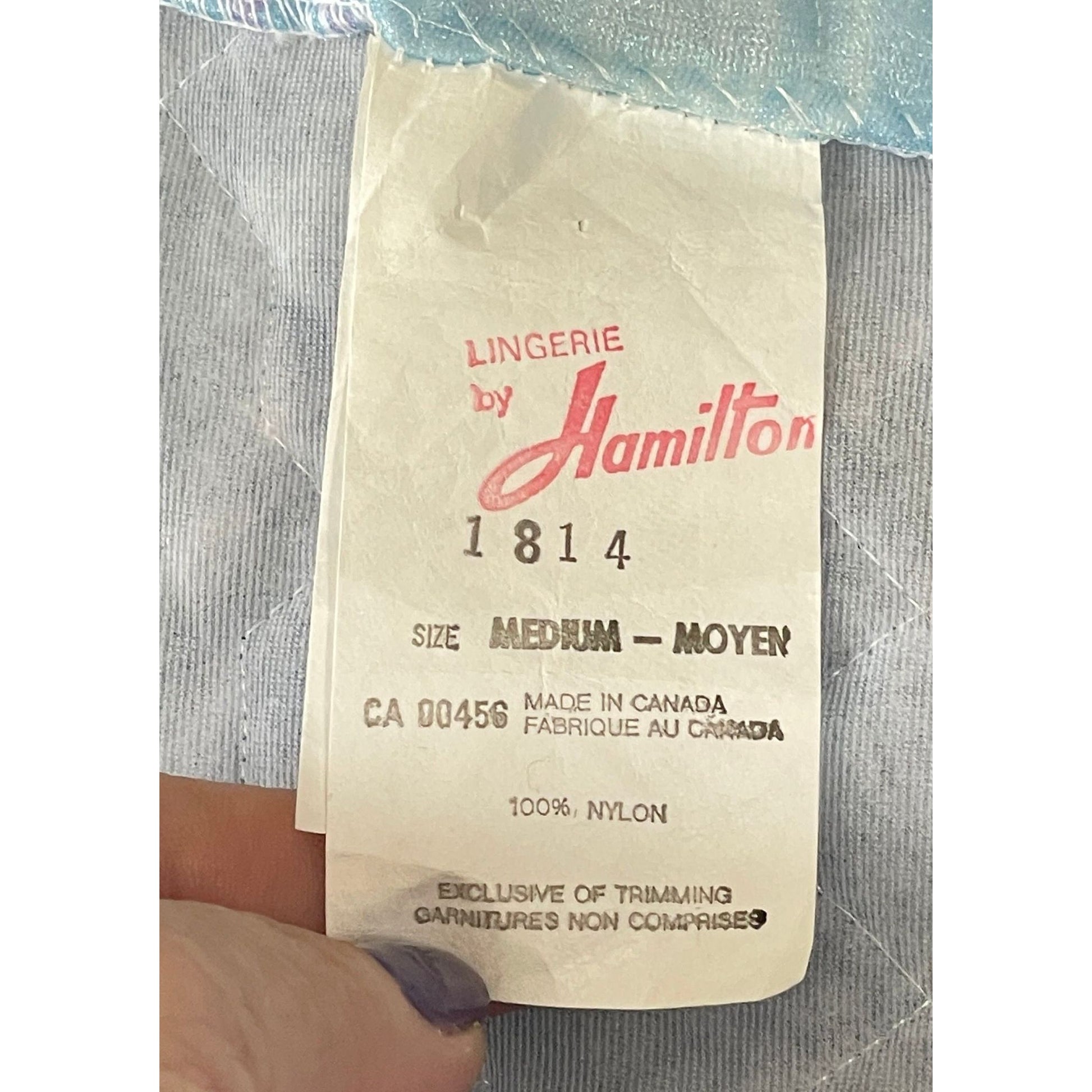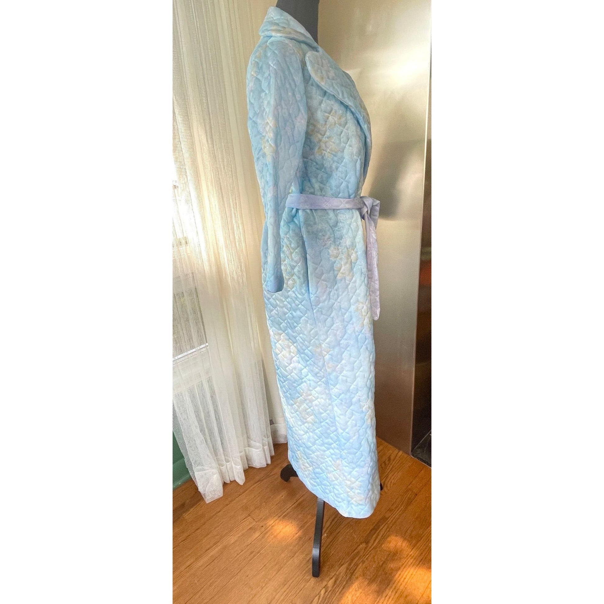 made in Canada by Hamilton Lingerie, this quilted housecoat has large oversized lapels, an assorted belt and one side pocket. Length is lower mid calf. Please note that although the belt matches the robe, it is mostly lavender instead of blue.