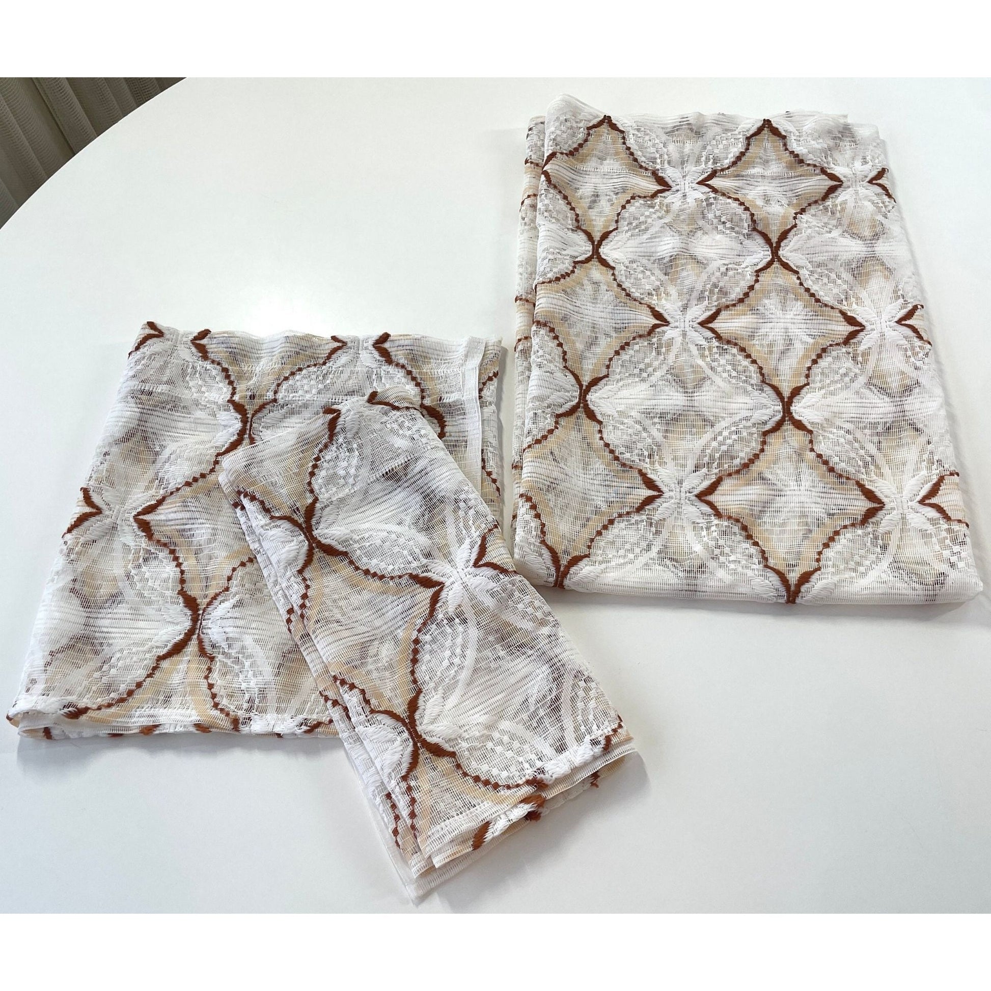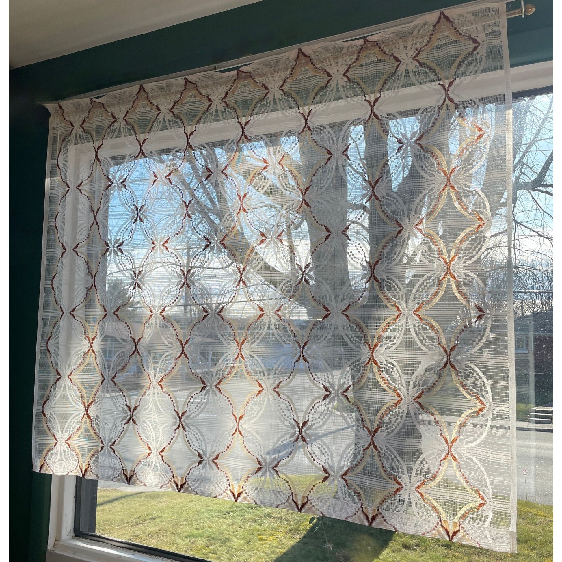 Vintage 70s woven white, tan and brown sheer curtain, choice between a single panel or a valance.