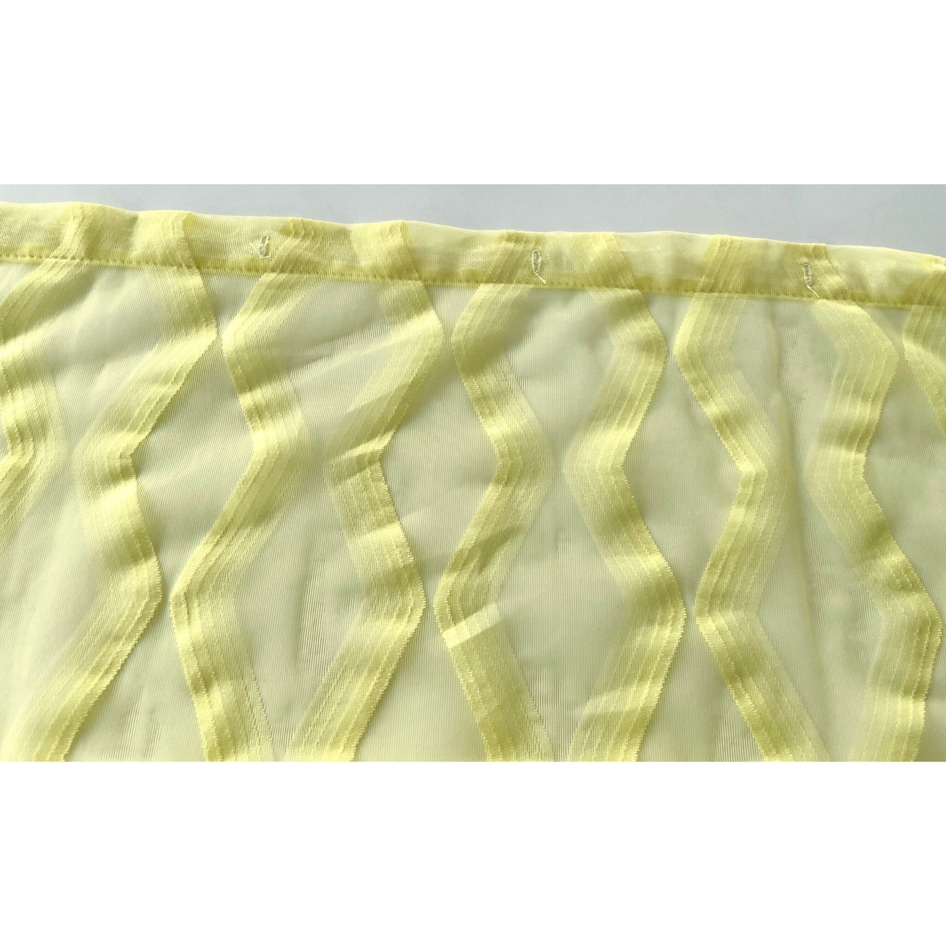 Decorative mesh shower curtain, bright yellow with abstract geometric stripes, tone on tone pattern.