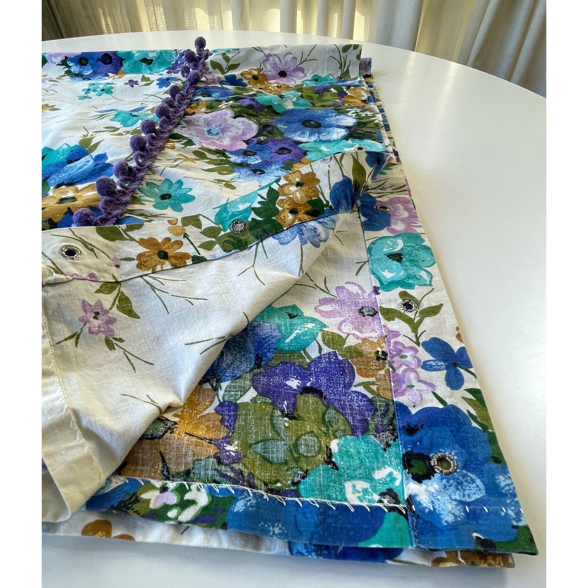 Vintage 70s purple and blue shower curtain, with valance and pom poms