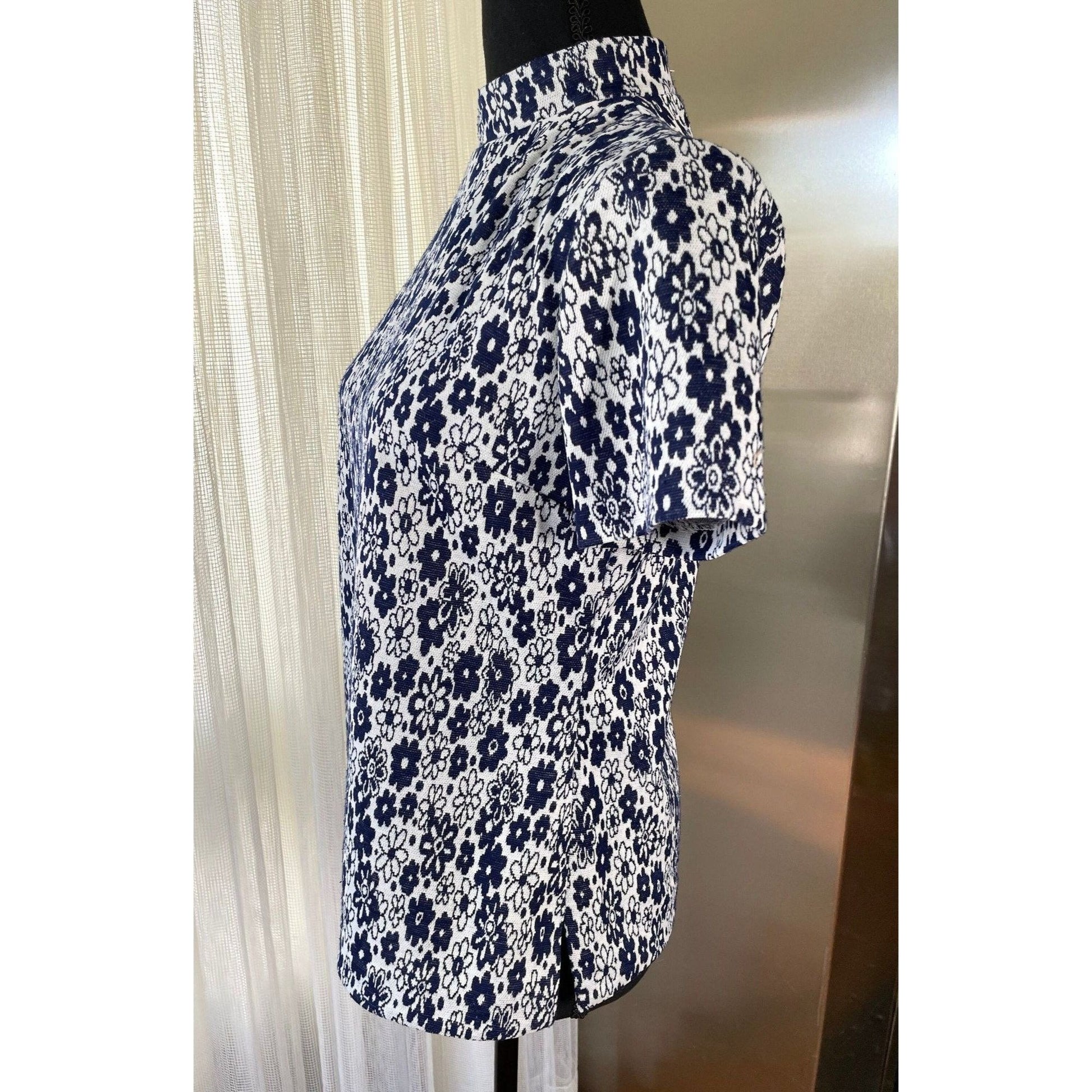 navy and white daisies top, funnel collar, short sleeves and zipped in the back.